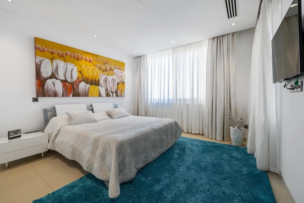 The villa, set on three levels, features an amazing spacious sunlit living room, an equally large modern kitchen and dining room, and one of the bedrooms on it’s ground level. The remaining three bedrooms are tucked away on the top floor, all featuring amazing views, tastefully selected top quality furniture, and huge bathrooms. All the living areas boast floor-to-ceiling windows, VRV air-conditioning, spotlights, and underfloor heating.