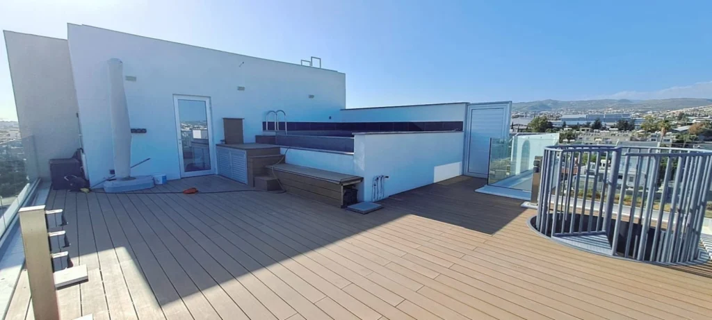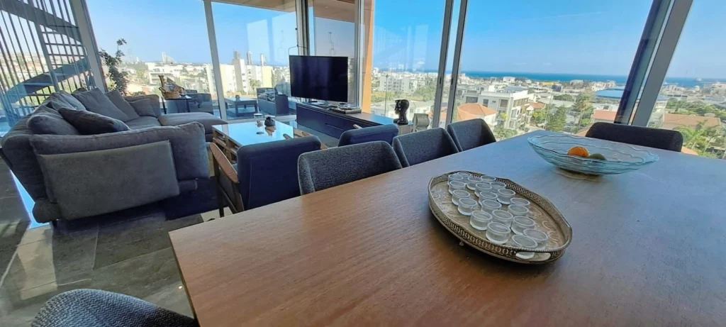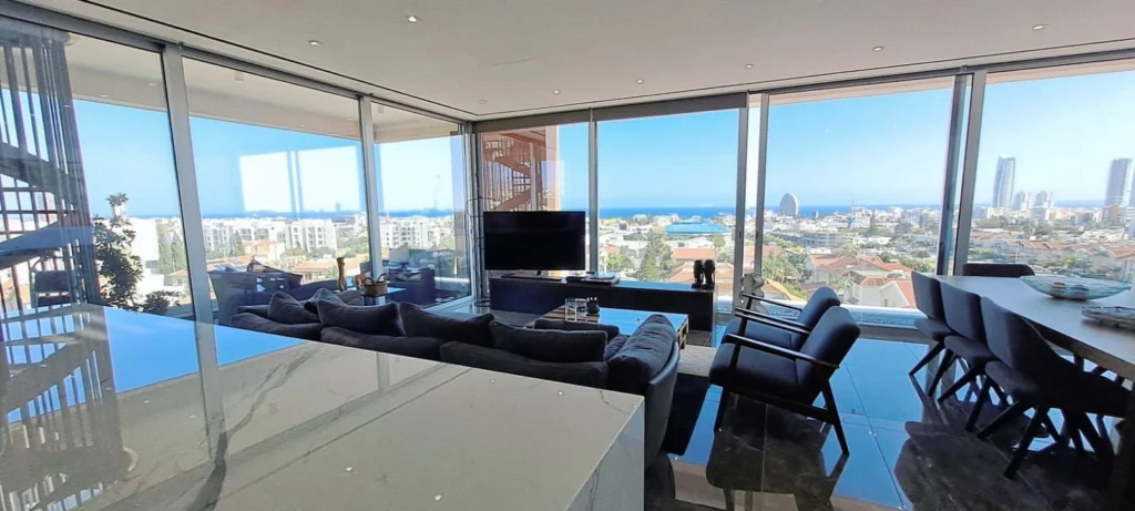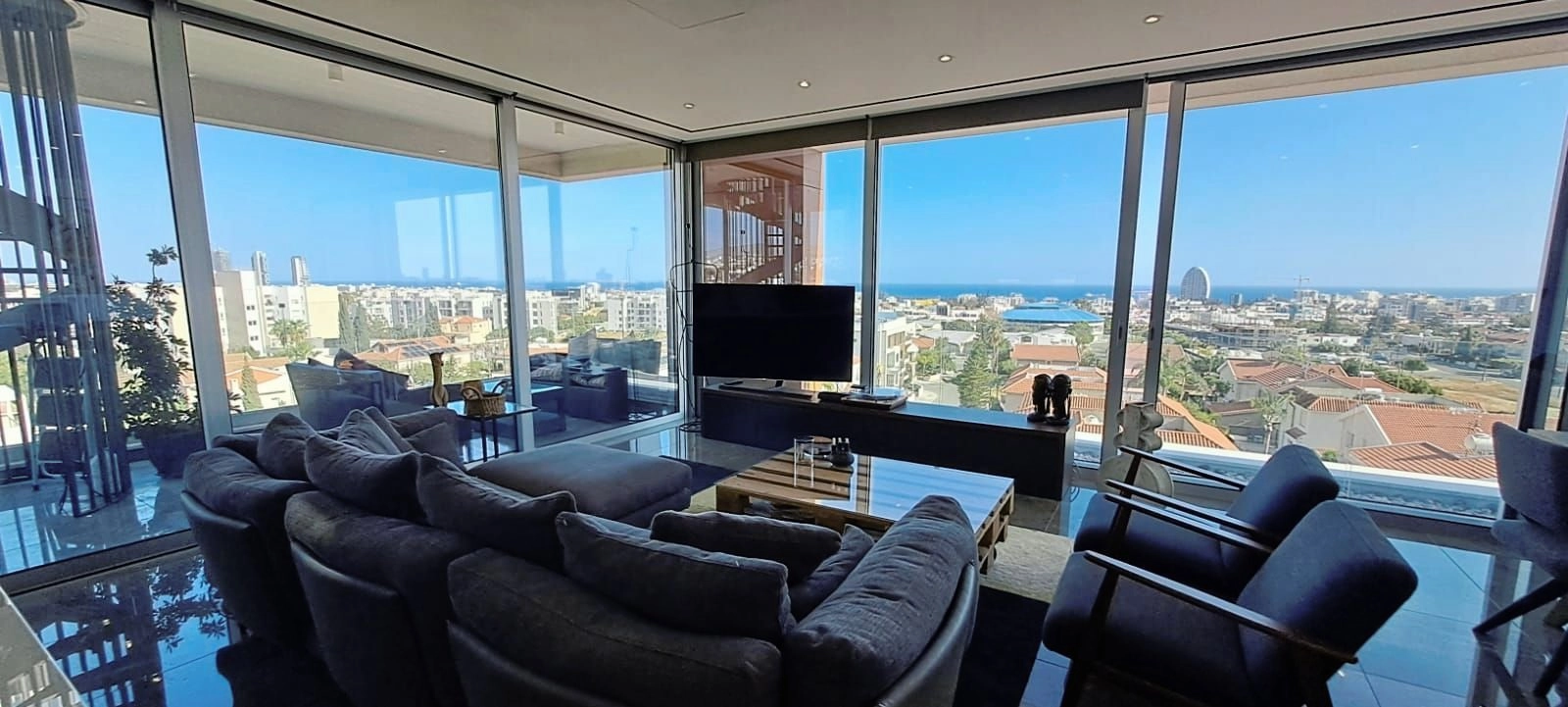 This luxurious three bedroom penthouse boasts a spacious indoor space with spectacular views of Limassol Town and the Mediterranean Sea. Offering stunning unobstructed views of Limassol's skyline and sea, it features two covered verandas and a rooftop, accessible both from inside the flat and the common areas. Residents can enjoy exclusive amenities such as an overflow swimming pool with jacuzzi jets, top-brand A/C units, underfloor heating, and floor-to-ceiling German insulated windows. The property also includes photovoltaic panels, electric blinds, and shutters, along with blackout curtains in the bedrooms. The Italian-manufactured kitchen is complemented by a Franke Vital tap providing filtered water, while the rooftop hosts a kitchenette, shower, and toilet. With a total of four toilets, two showers, and one bathroom, this apartment ensures convenience and comfort. Additional features include high-quality porcelain tiles, laminated parquet floors, ample power and connectivity points, hidden lighting in the living room, and spacious wardrobes. Security is prioritized with a covered private parking space, security flat entrance door, cameras in the parking area and building entrance, provision for a wireless alarm, and an entrance phone with full-color video. Residents also benefit from a storage room, electric gated entrance, and a landscaped garden. Situated in a prime and affluent location in the Agios Stylianos area of Limassol, just 1.3km from the beach, with easy access to the motorway and downtown, this property offers a luxurious and convenient lifestyle. Please call to schedule a viewing of this magnificent property.