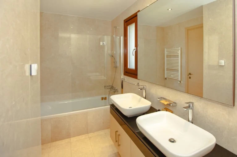 The en-suite bathroom is fitted with twin wash basins in a marble vanity unit, and bath/shower combination.