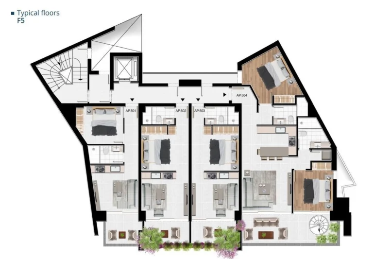 The two bedroom apartments consist of an open space living room and kitchen: 2 bedrooms and 2 bathrooms and a balcony and roof top terraces for the penthouse.