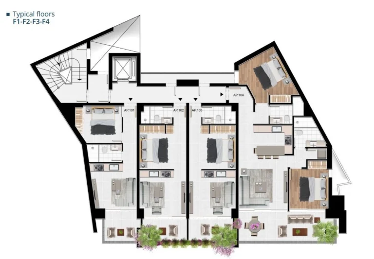 The two bedroom apartments consist of an open space living room and kitchen: 2 bedrooms and 2 bathrooms and a balcony and roof top terraces for the penthouse.