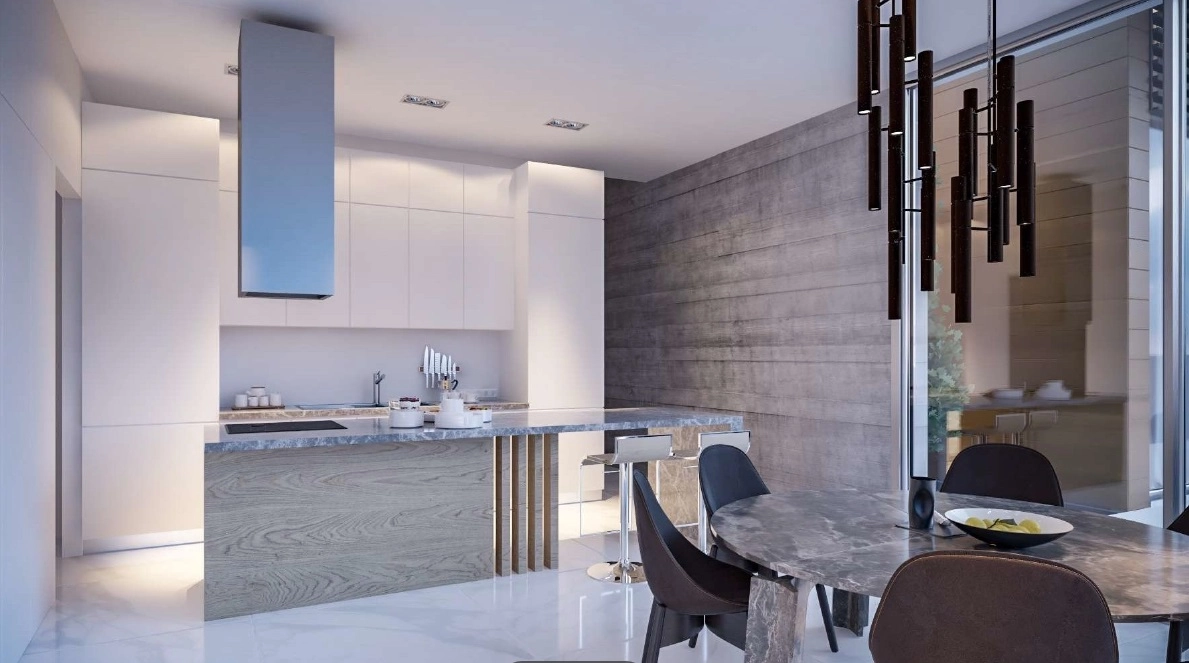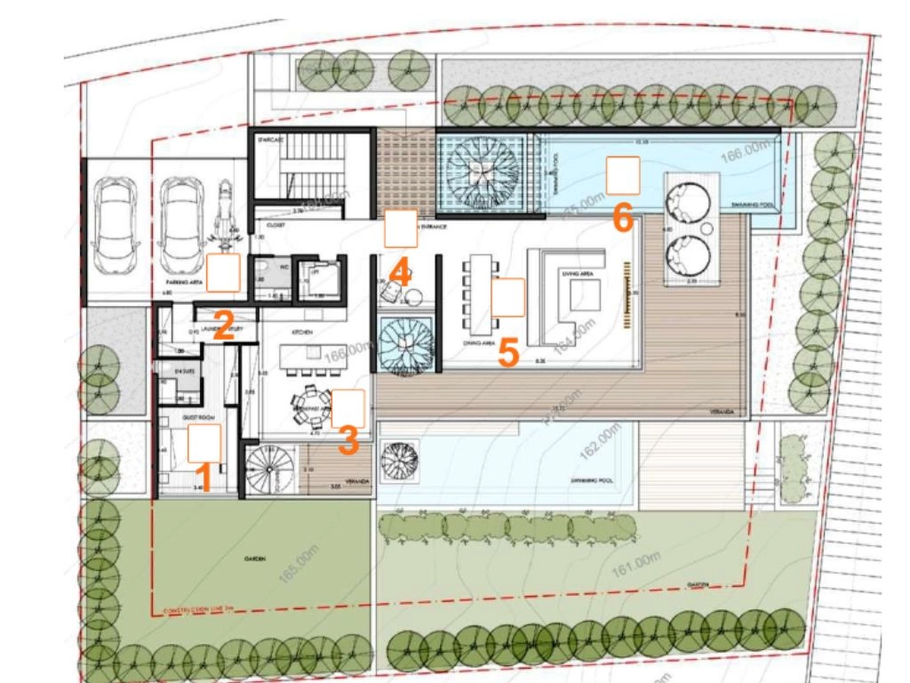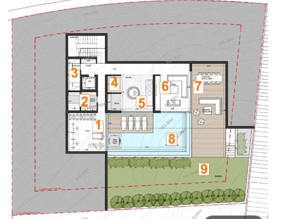Villa for sale at the design stage in Agios Tikhonas (Limassol). Plot size = 853 m2. Total internal area = 449.6 m2. Total covered veranda = 197.5 m2. Swimming pool = 32 m2. Garden = 132 m2. Covered parking = 41m2. Elevator. Additional features: gym, TV room and playground. Jacuzzi, sauna, parquet floors, air conditioning, underfloor heating, smart home system, double-glazed windows.
