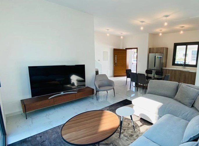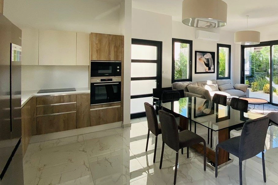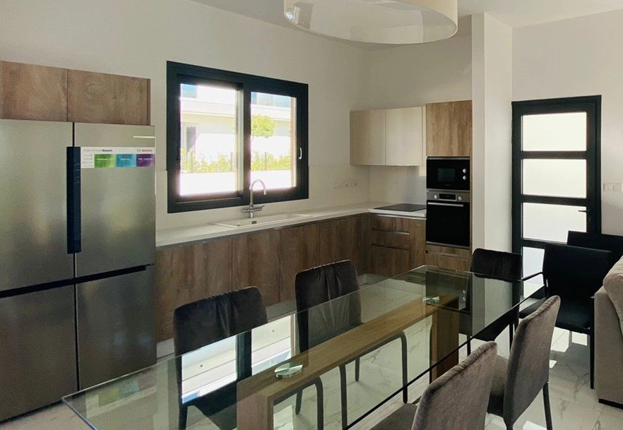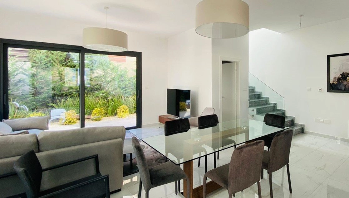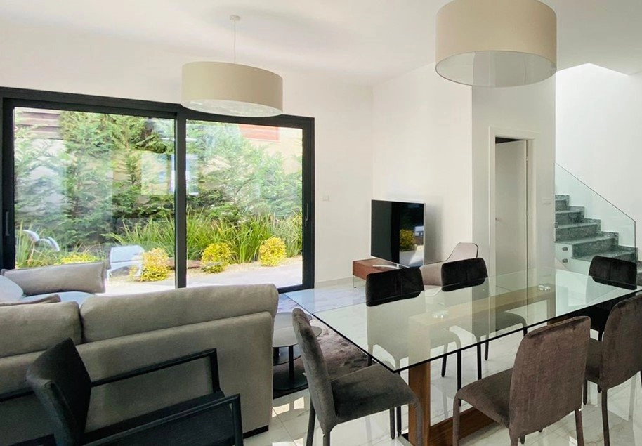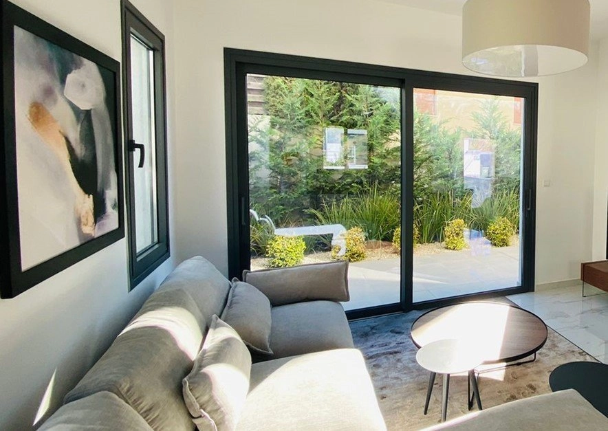 The 2-bedroom semi-detached houses follow a modern modular design with exterior wood finishes and private landscaped gardens with mature trees and a convenient automatic irrigation system. All 4 houses include underfloor heating and double glazed windows for maximum comfort throughout the year as well as provisional electric shutters, solar system for hot water, ample parking as well as access to the hildren’s playground and communal swimming pool.