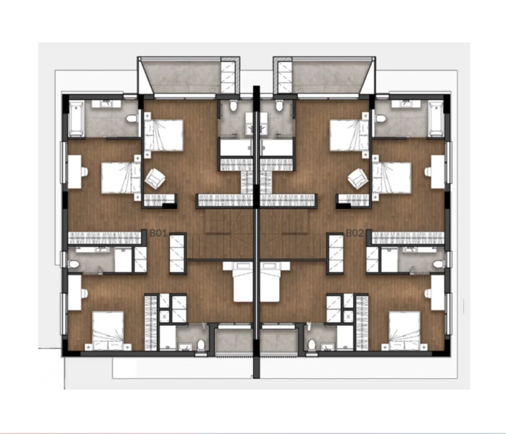 The new project, consisting of four two-storey villas on a plot of 1,387 m2, is located in one of the most attractive areas of Limassol, Agios Athanasios. Each villa consists of a spacious living room with a veranda overlooking the garden, a kitchen and a guest toilet on the ground floor, as well as four bedrooms on the second floor, each with its own bathroom. Each house is characterized by high energy efficiency, high-quality materials, modern design and thoughtful layout. The advantage of the location is the proximity to the highway, the city center, schools, hospitals and a busy tourist area. Indoor covered area: 202 m2, Covered terraces: 37 m2, Covered Parking: 48 m2, Total covered area: 287 m2, Private plot area: 256 m2, Common areas: 63m2, Total land area: 319 m2.