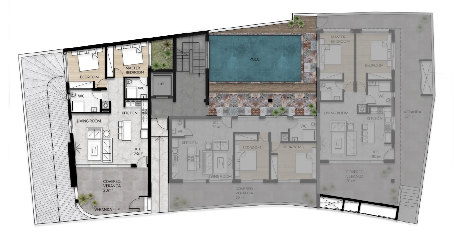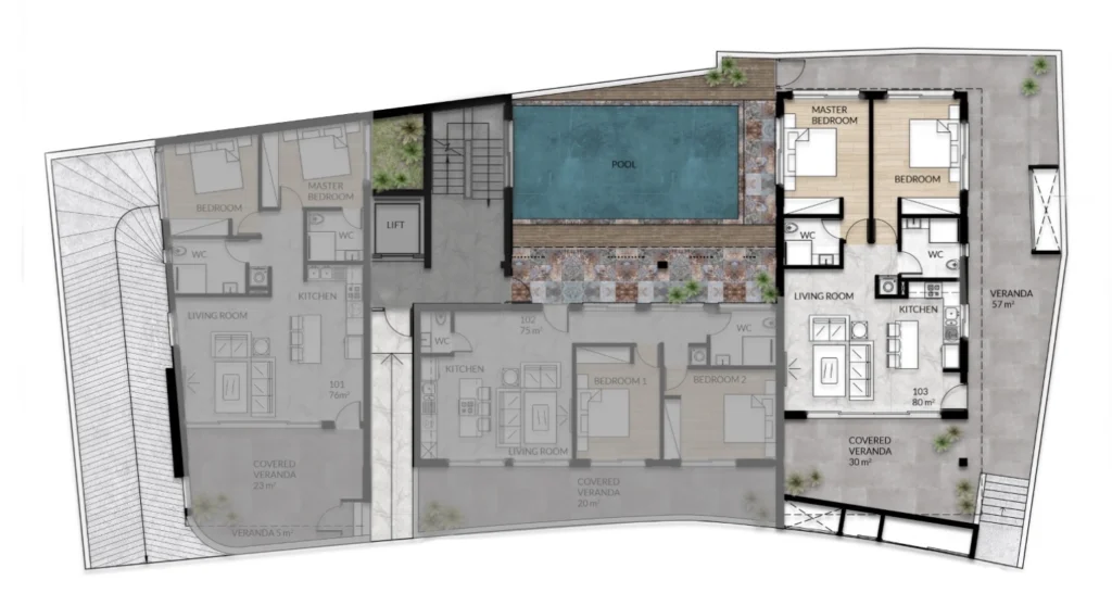 A new residential complex consisting of eight luxury apartments, including six spacious two-bedroom apartments and two penthouses with private roof gardens. It is located in the picturesque village of Agios Athanasios, just 200 meters from the motorway and close to Limassol with its beaches and urban amenities. Families will appreciate the proximity to Foley’s and Golden Oak private schools, as well as the walking distance to the best taverns, kiosks and bakeries. Each apartment has a private underground parking, a storage room, spacious living rooms and balconies. The communal pool and rooftop garden create a private space for great parties. Each apartment is equipped with photovoltaic panels.