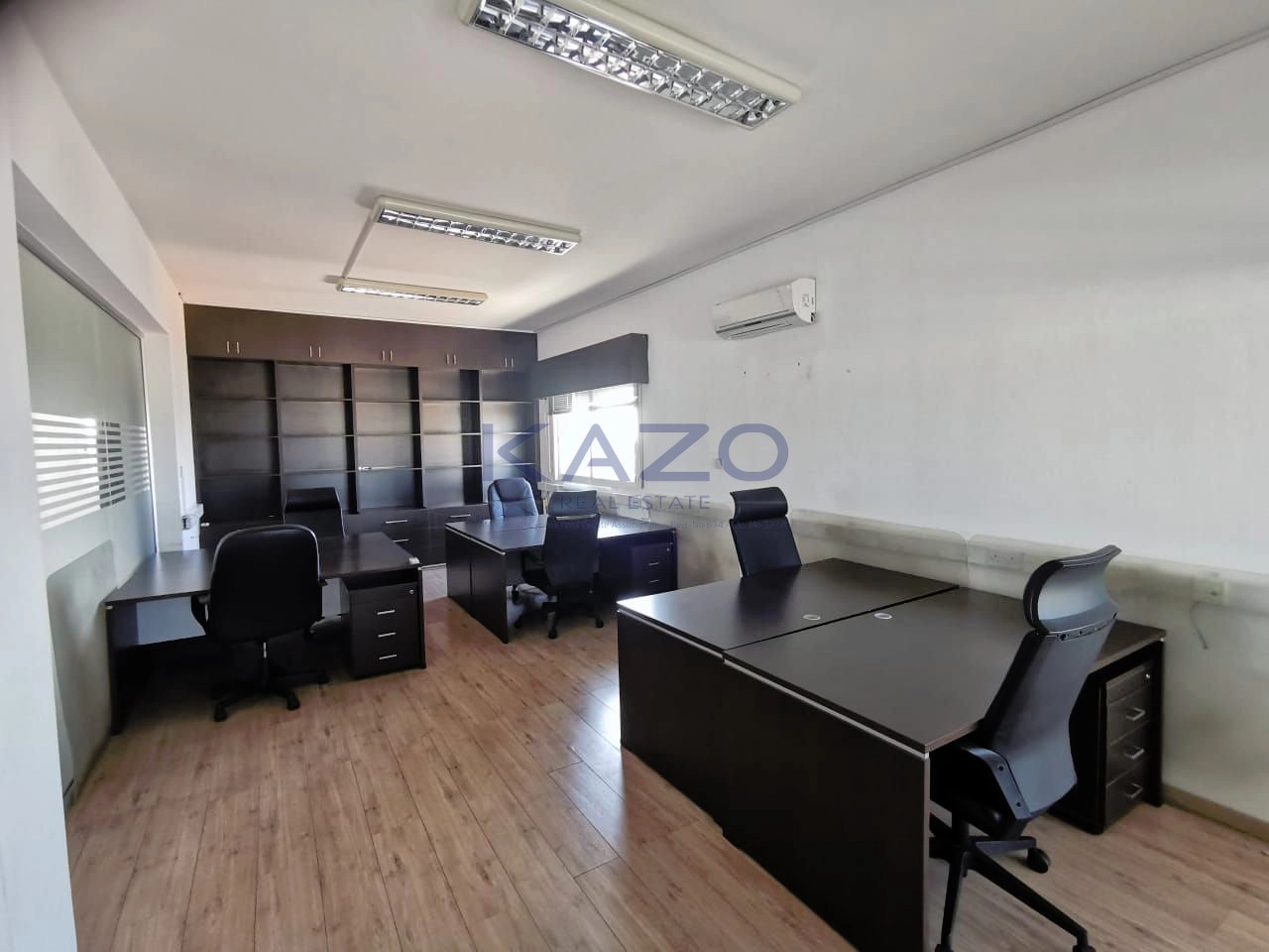 Office room 1: 6 Offices with extensions and drawers, 6 office chairs, AC, one big shelve.