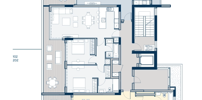 The project is split into different zones. There are 28 exquisite apartments, each with one, two, or three bedrooms, within separate modern blocks. For residents who prefer detached houses, we additionally offer 7 luxurious villas with additional amenities to upraise the level of your living. More than half of the plot area is allocated for landscaping of the territory – with walking zones, recreation, picnics, sports and entertainment, playgrounds. Our experience in differentiated projects allowed the ergonomic layout to provide the maximum efficient use of spaces: thoughtful segmentation to private and guest zones, spacious kitchens and living rooms, planned storage spaces, master bedrooms with en-suite bathrooms, guest bathrooms all under high ceilings and protected by our uniquely designed tall doors. The project is set in one of the most prestigious locations of Mouttagiaka, a suburb of Limassol, with its thoughtful infrastructure, where privacy, necessary amenities, entertainment facilities and the best beaches are within your reach through a comfortable access to the highway. The area around Mouttagiaka is known for its natural beauty, with scenic views of the Mediterranean Sea and the Troodos Mountains in the distance. This setting provides a peaceful and picturesque backdrop for everyday life.