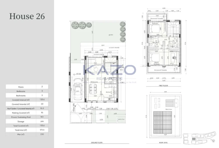 The ground floor will boast a modern kitchen, open-plan living and dining areas, and access to the garden and optional swimming pool through large sliding windows. This floor will also include a guest WC, a small kitchenette, and a storage room. The first floor will house the en-suite master bedroom, two additional spacious bedrooms, and the main bathroom.