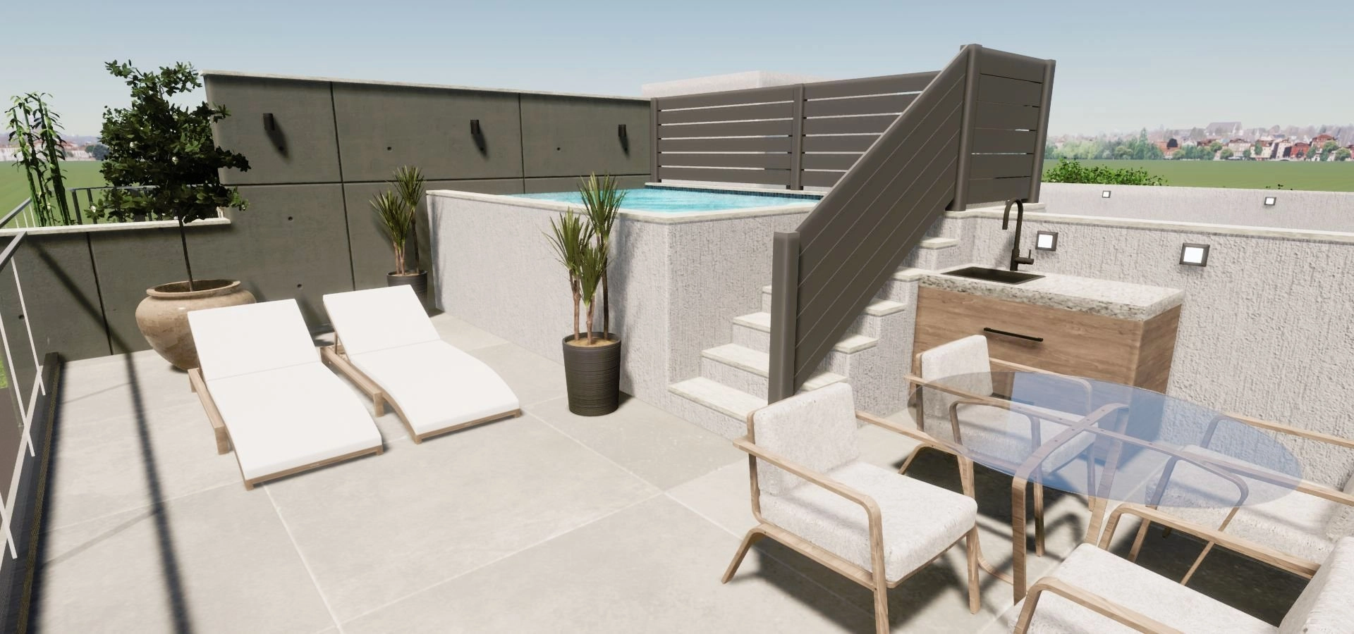 This specific top-floor two-bedroom apartment features a roof garden, with an internal area of 78 sqm, an 18.3 sqm covered veranda, and a 46.3 sqm roof garden. It also includes covered parking and a storage room. The apartment boasts an open-plan kitchen with a living and dining area, a main bathroom with a shower, a master bedroom with an en-suite bathroom, and another spacious bedroom. The living room opens to a large veranda through expansive sliding windows, and a spiral staircase leads to the roof garden with a private pool and stunning views.