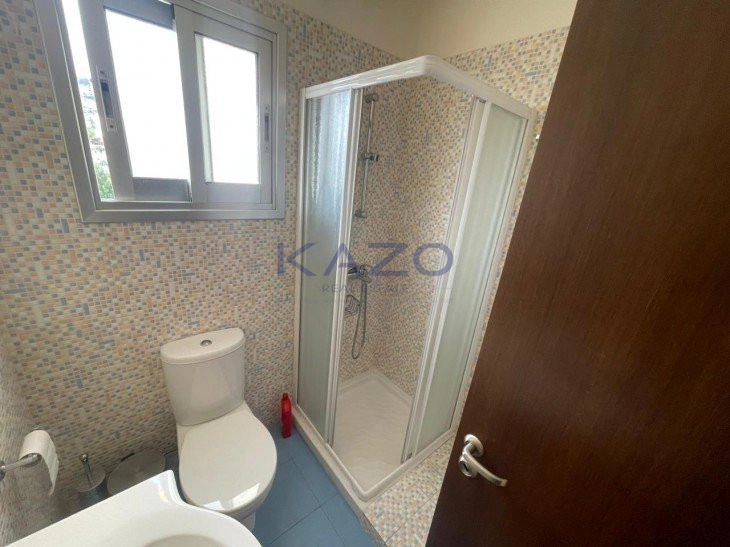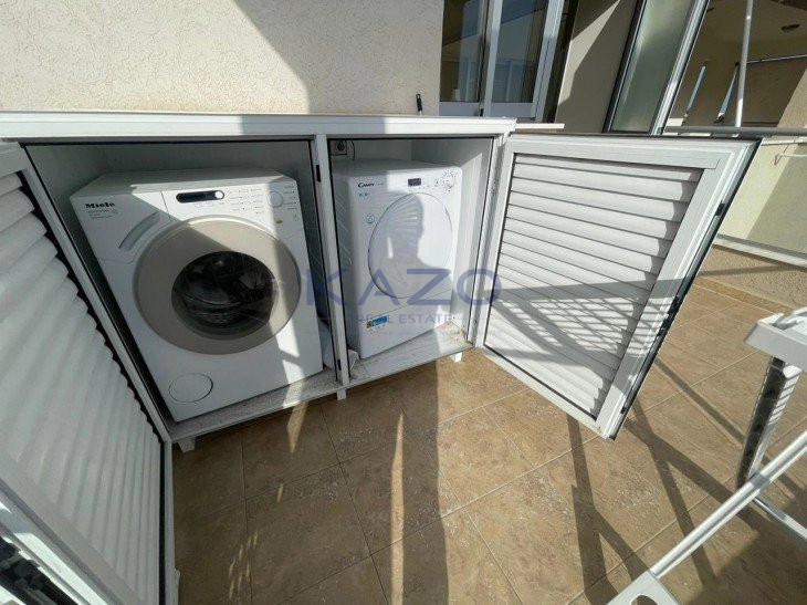 This top-floor three-bedroom apartment covers an internal area of 120 square meters and an external area of 76 square meters and two balconies with panoramic view, including the main bedroom with an en-suite shower, two additional bedrooms, a main shower, a guest toilet, a separate kitchen with dishwasher and laundry space, dining, and living room area. The apartment is offered semi-furnished and equipped with all the needed electrical appliances. More specifically, this amazing flat comes with electrical devices (fridge, electric cooker, washing machine,dryer machine, dishwasher air-conditioning unit, and more), a solar and electric water system, laminate parquet flooring in all bedrooms, a storage room, and a private covered parking space.