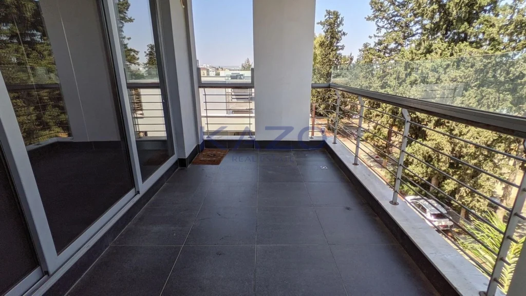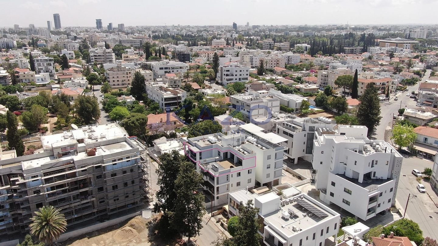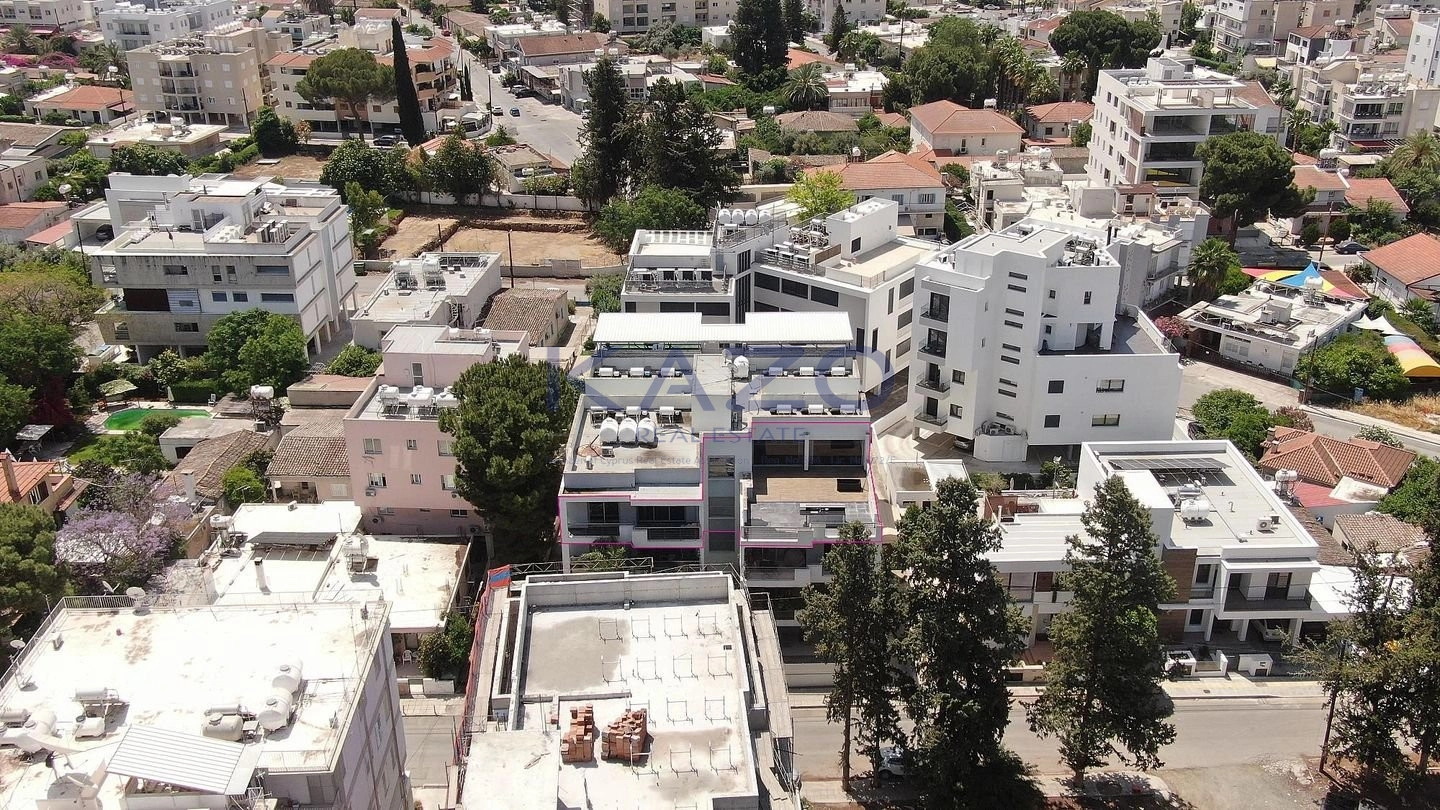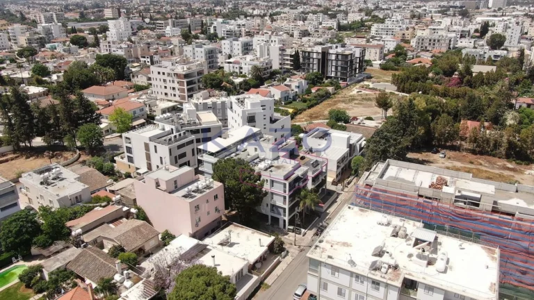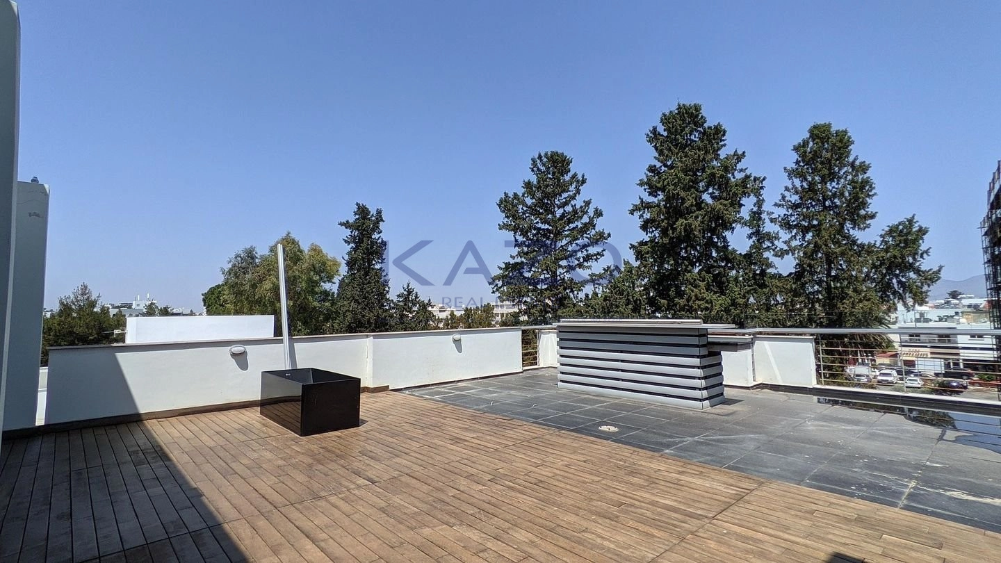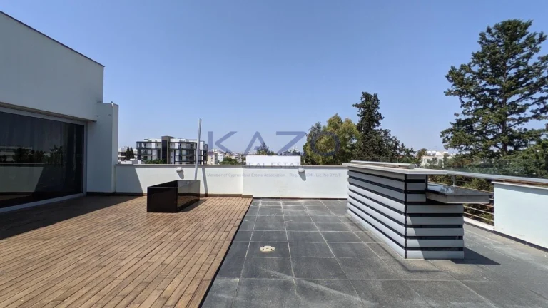 Top-floor three bedroom apartment on a 3 storey building, in Engomi, Nicosia. The apartment comprises of an open plan area with entrance/ living room/dining room area, a guest toilet, kitchen with sitting room, three bedrooms, (master bedroom with an en suite bathroom) and a family bathroom. Furthermore it offers a covered terrace and a big uncovered terrace/patio with a bar of approximately 91 sq.m. It is located approximately 750m from B9 motorway, approximately 1km from Agios Dometios community centre and approximately 3km from Engomi community center. The property falls within Zone Κα4, with a building coefficient of 120%, coverage of 50%, and permission for 3 floors (13.5m) of construction. There is a separate title deed for this property. Energy Category: E