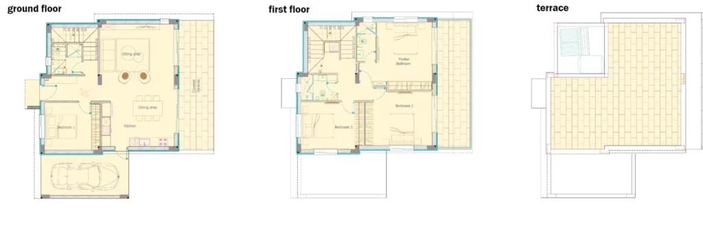 A villa for sale with sea views, which boasts an excellent location just 30 meters walk from the sea and access to amenities, restaurants and services open all year round. A unique opportunity for permanent residence, holiday home or as an investment property. Upon entering the villa, you will see an open-plan kitchen, dining room and living room. Go into the living room to enjoy moments of comfort and relaxation. There you can enjoy the view of your own overflow pool through two-chamber heat and sound-proof aluminum doors from floor to ceiling. A guest bathroom completes the layout on this floor. In the case of Villa No. 3, there is one bedroom on the ground floor. Going up to the second floor, you will find four (or three) spacious bedrooms, of which the master bedroom is equipped with its own shower for additional comfort. There is a laundry room and a shared family bathroom. Go up one more flight and you will discover a rooftop garden with panoramic sea views. If desired, you can add a basement.