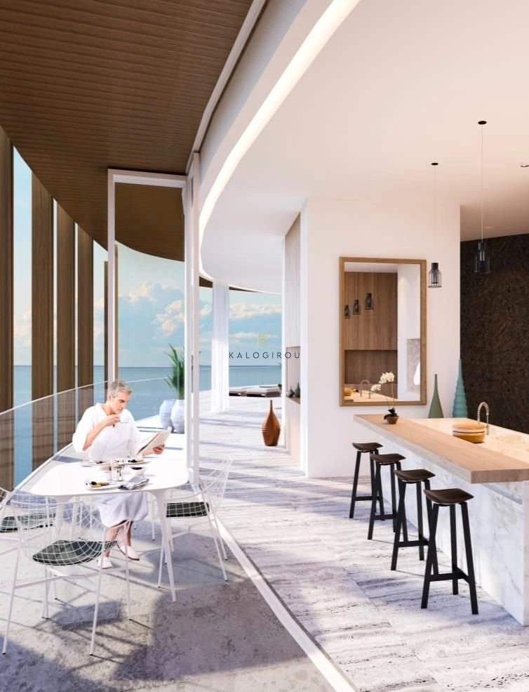 Apartment for sale in Agia Napa. The property consists of an open plan kitchen living and dining area, two spacious bedrooms, each bedroom has its own en-suite, one guest WC, utility and electrical room, a storage room. It has internal covered area of 157 sq m, offering 34. sq. m of covered veranda, covered parking, common swimming pool and common gym and spa.