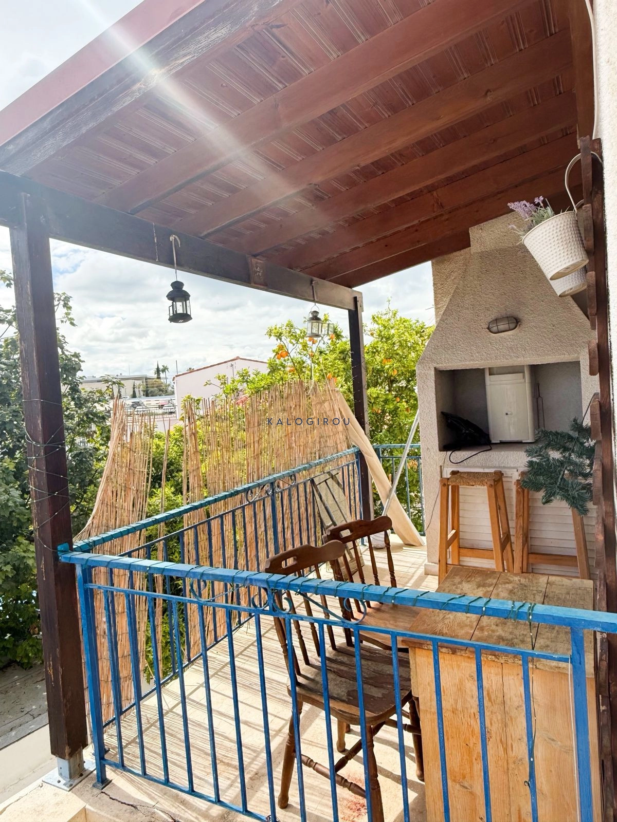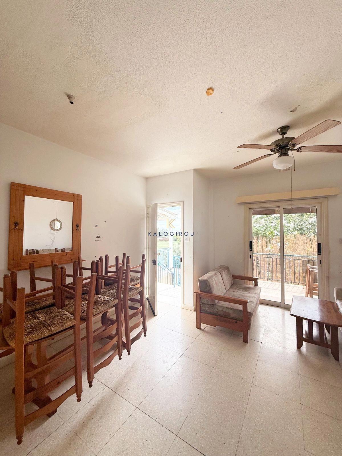 Apartment for sale in Oroklini, Larnaca. The property is fully furnished and consists of an open plan kitchen, living and dining area, A/C, kitchen appliances, two bedrooms, 1 bathroom, 1wc and veranda with barbeque and sea side view.