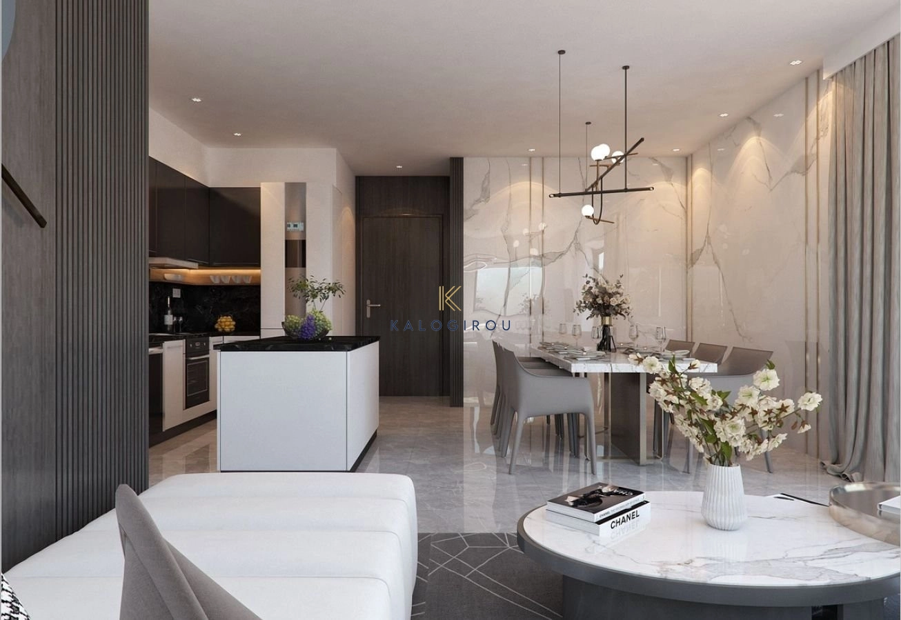 Top Floor Apartment for Sale in Kamares area, Larnaca. This modern apartment consists of an open plan kitchen and living room with dining area, two bedrooms, one bathroom, one en-suite shower in the master bedroom, provision for A/C, 12 sq.m. covered veranda and roof garden of 54 sq.m. Moreover, the property has allocated covered parking and storage room on the ground floor.