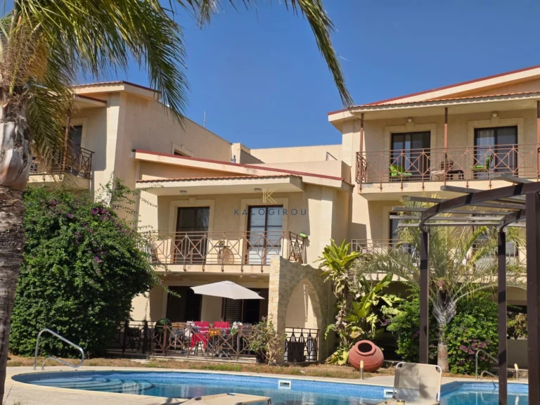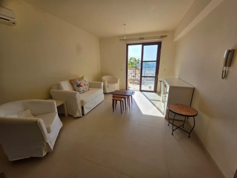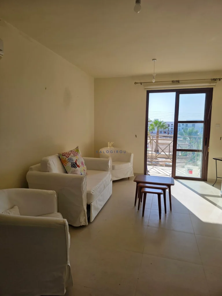 Apartment for Sale in Oroklini Village. The property consists of two bedrooms, an open plan kitchen with living room and dining area, 1 family bathroom with wc, guest toilet, uncovered parking, A/C, common swimming pool. The property has a spacious veranda with a very big garden area.