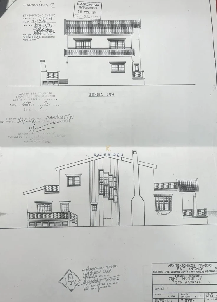 House for sale in Larnaca, Livadia area. The property has internal covere area of 254 sqm in a plot of 590sq m. The house is double storey, on the ground floor consists of a spacious open plan living/dining area with fireplace, kitchen and a guest toilet. A spiral staircase leads you to the first floor which consists three bedrooms the master en-suite and a main bathroom. Spacious covered verandas are in the front and the back of the house. More over the property has separate utility room of 15 sq. m with kitchenette, shower and w/c. Externally you can enjoy large garden and covered parking space.