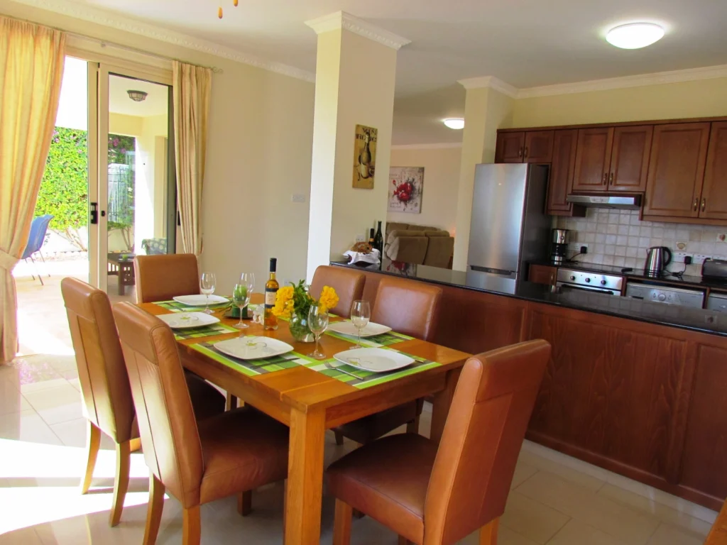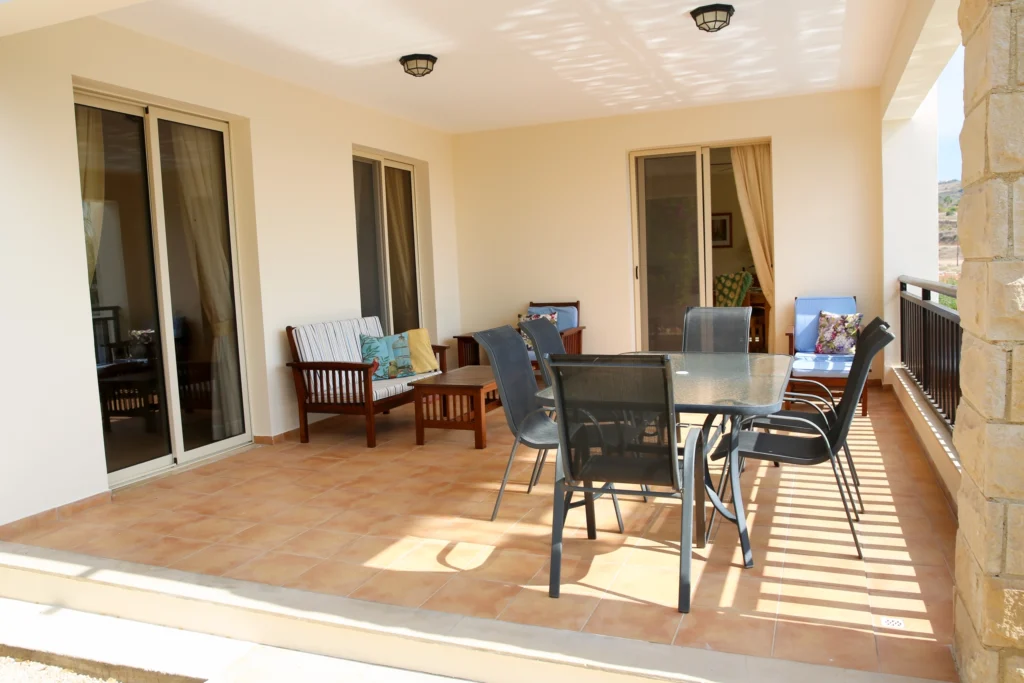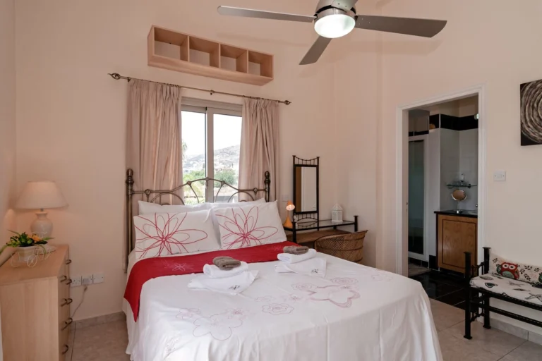 Three generous bedrooms all come complete with fitted wardrobes. The master bedroom has a double bed while the other two rooms have twin beds. The large upstairs balcony offers magnificent views of the Paphos coastline.