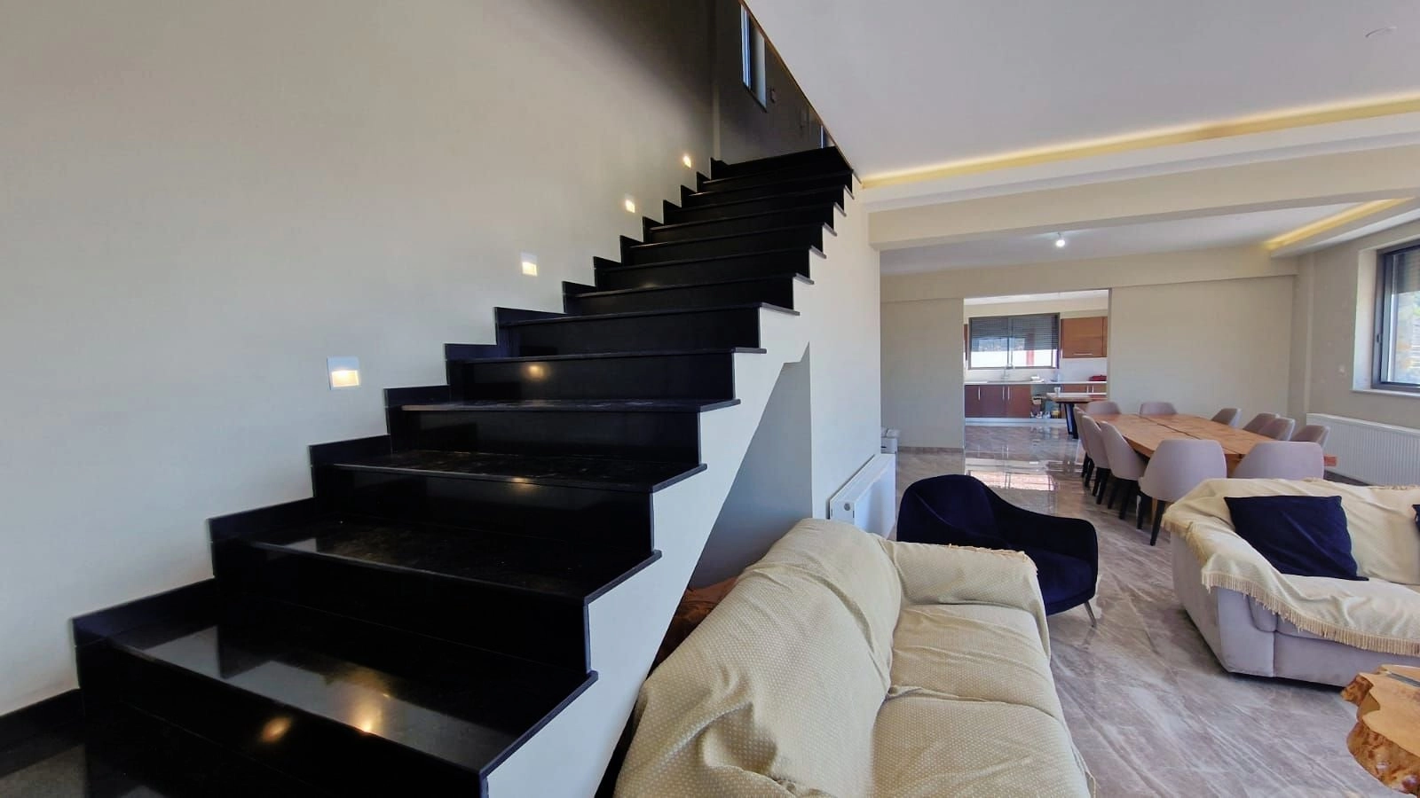 High-end finishes include Rabel aluminum windows, double glazing, granite countertops, granite staircase and fireplace, and provisions for AC and CCTV. Additional features include a state-of-the-art heat pump and a solar photovoltaic system, making this home both luxurious and energy-efficient.