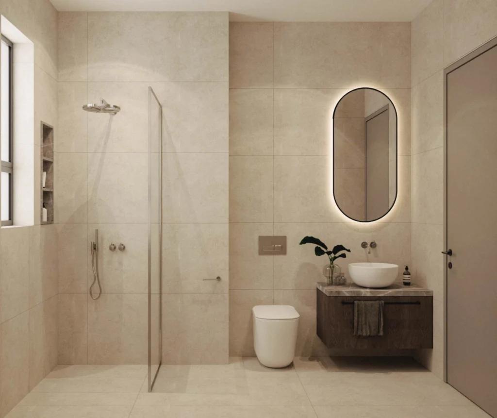 A stylish bathroom is finished with elegant tiling, premium fixtures, and contemporary detailing, balancing comfort with sophistication.