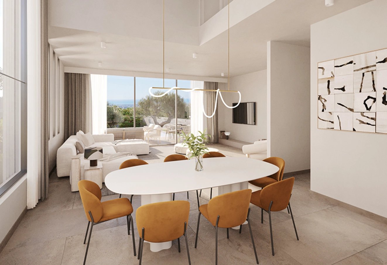 The modern architectural approach blends the project seamlessly with the natural environment, creating spacious and efficient interior areas. The location is exceptional, providing unobstructed views of Pafos and the Mediterranean Sea from every single house. The village center is only 2 minutes away, offering convenience without compromising tranquility.