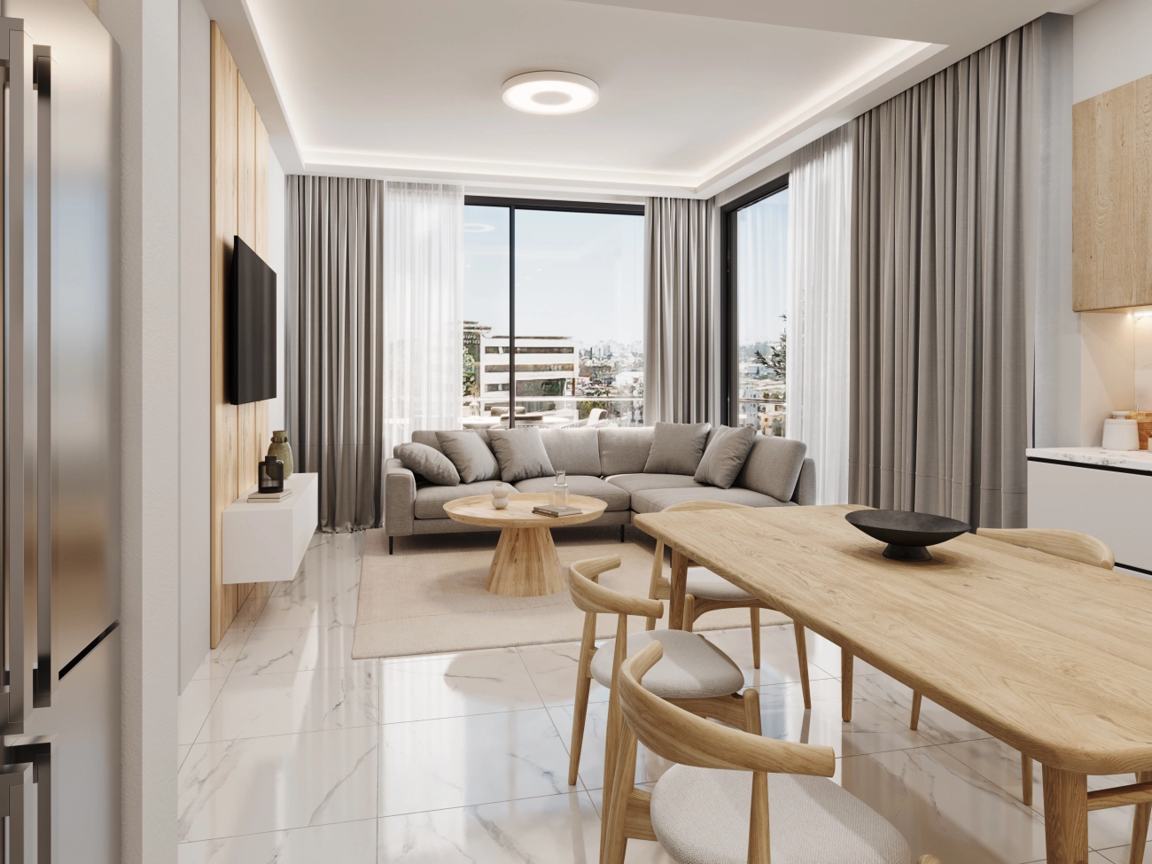 The building’s communal areas electricity consumption will be covered by green energy, while lush greenery will surround the building creating calmness in the heart of urban living.The property boasts meticulously designed areas to elevate your living experience. In the kitchen, you’ll find soft-closing cabinets and elegant granite counters. The living room seamlessly merges with the dining area, featuring floor-to-ceiling windows that flood the space with natural light and decorative false ceilings for a sleek finish. Step out onto the large, covered veranda and take in the surroundings. The master bedroom offers floor-to-ceiling wardrobes for ample storage, along with an ensuite bathroom that includes flat showers and a bowl washbasin. The standard bedroom also features floor-to-ceiling wardrobes and a covered veranda. Technological amenities include a security entrance phone, photovoltaics, solar panels for water heating and water pressure system. Provisions have been made for integrated AC in the living room, AC units in the bedrooms, and electric vehicle charging. Each apartment also comes with one parking space, private storage room, and washing machine cabinets, adding to the overall convenience and functionality of the property.