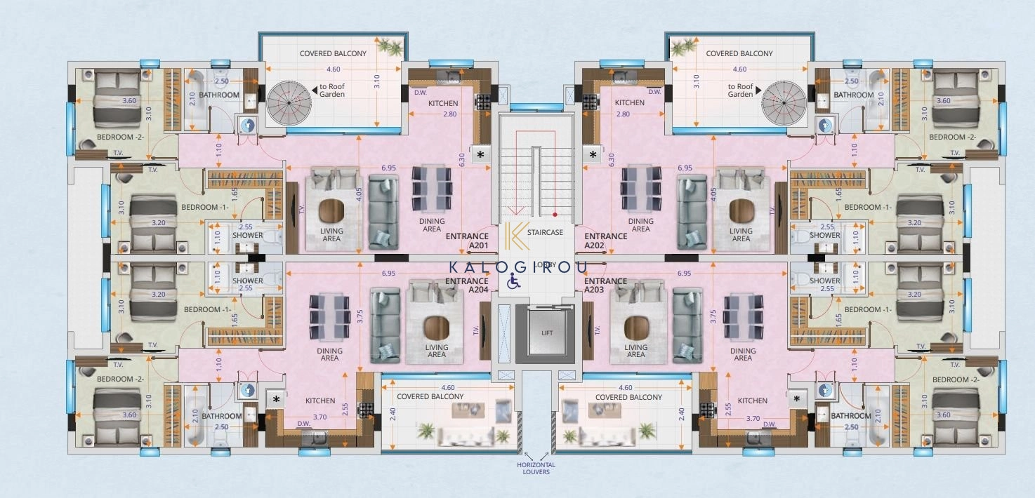 The project boasts of 18 apartments in total. All units are with spacious and contemporary living areas. The modern design makes excellent use of features like top quality italian ceramic finish, unique glass balconies and clever layout of living areas designed to offer optional space, privacy and also a views of the prestigious neighbourhood. Some of the second floor apartments benefit from individual private and luxury roof-gardens with amazing views of the lovely neighbourhood. Each apartment has one parking bay and a storage room on the ground level. In addition, all residents will have access to the communal swimming pool.