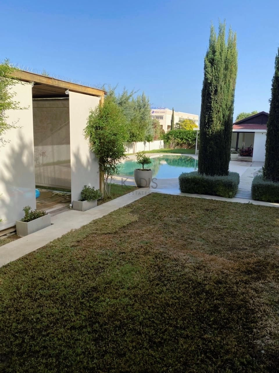 * Dining area overlooking green garden and pool