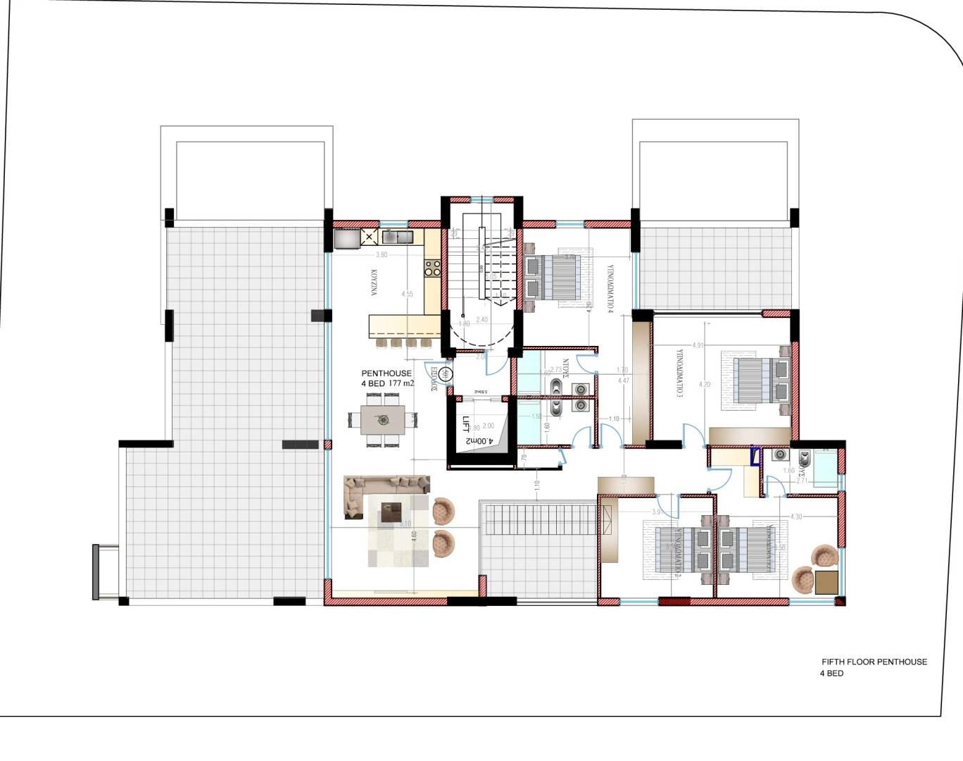 Apartment for sale with 2 bedrooms, located in the heart of Paphos, within walking distance from all infrastructure and the business center of the city. The apartments are characterized by a convenient layout and high-end finishes and equipment – with marble floors, fully furnished and Bosch appliances. All apartments have covered parking spaces and storage rooms.