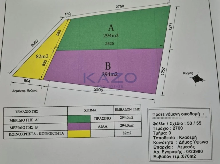 Residential Plot for sale in Ypsonas district. The residential plot holds a Ka7 zone with an 80% density ratio and a 45% coverage ratio, with three floors in height allowance. The half-plot holds 294 square meters.