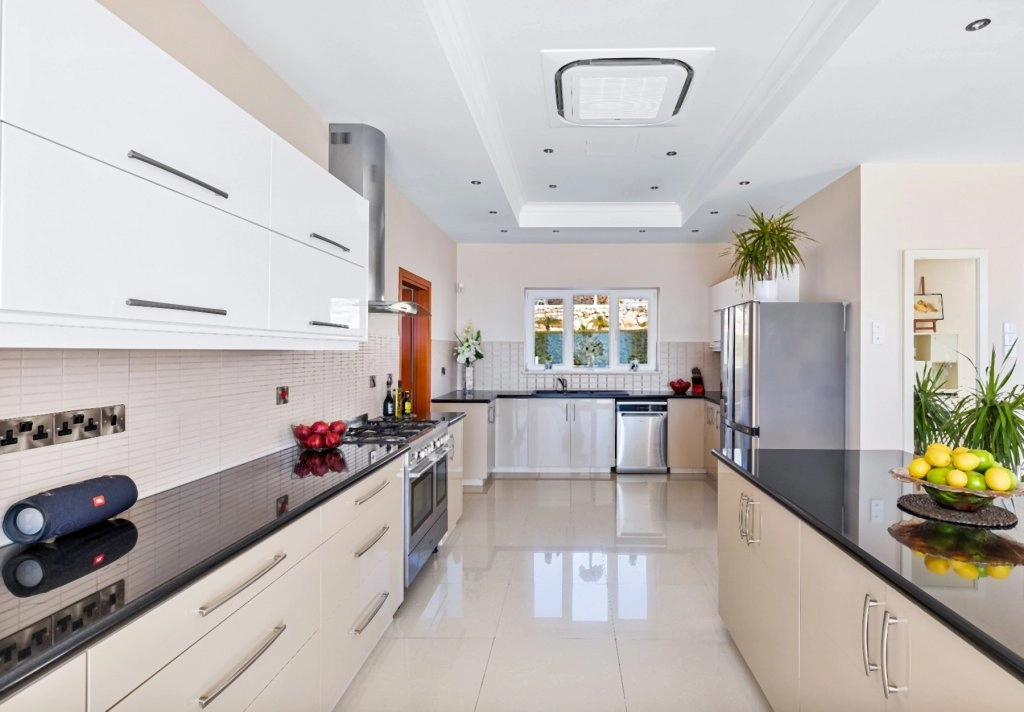 The living room, the dining spaces kitchen area form an open, coherent unit in Scandinavian style. The high ceilings emphasize the Mansion’s elegance. From the entire ground floor, the sea view is stunning.