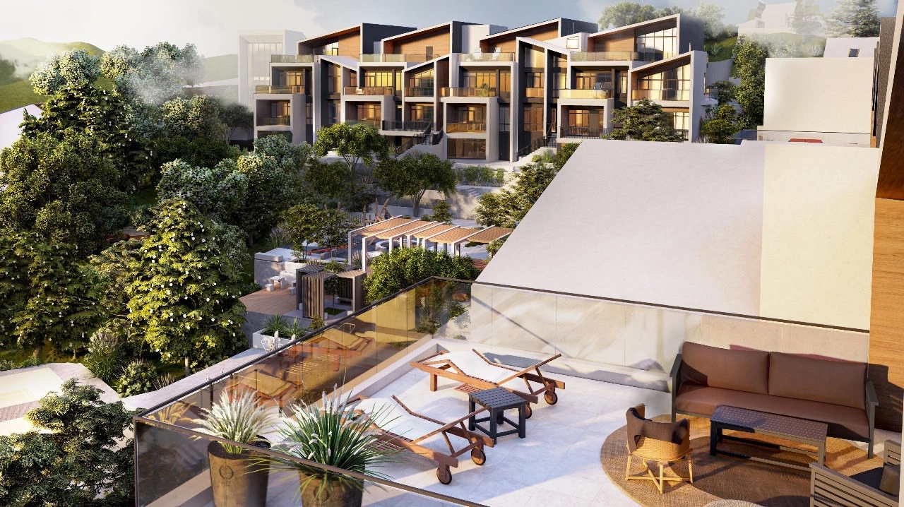 The project consists of 45 elegant apartments. The infrastructure of the complex includes swimming pools and green areas for recreation, tennis court, sauna, cafe, beauty salon, fitness space, yoga corner, SPA.
