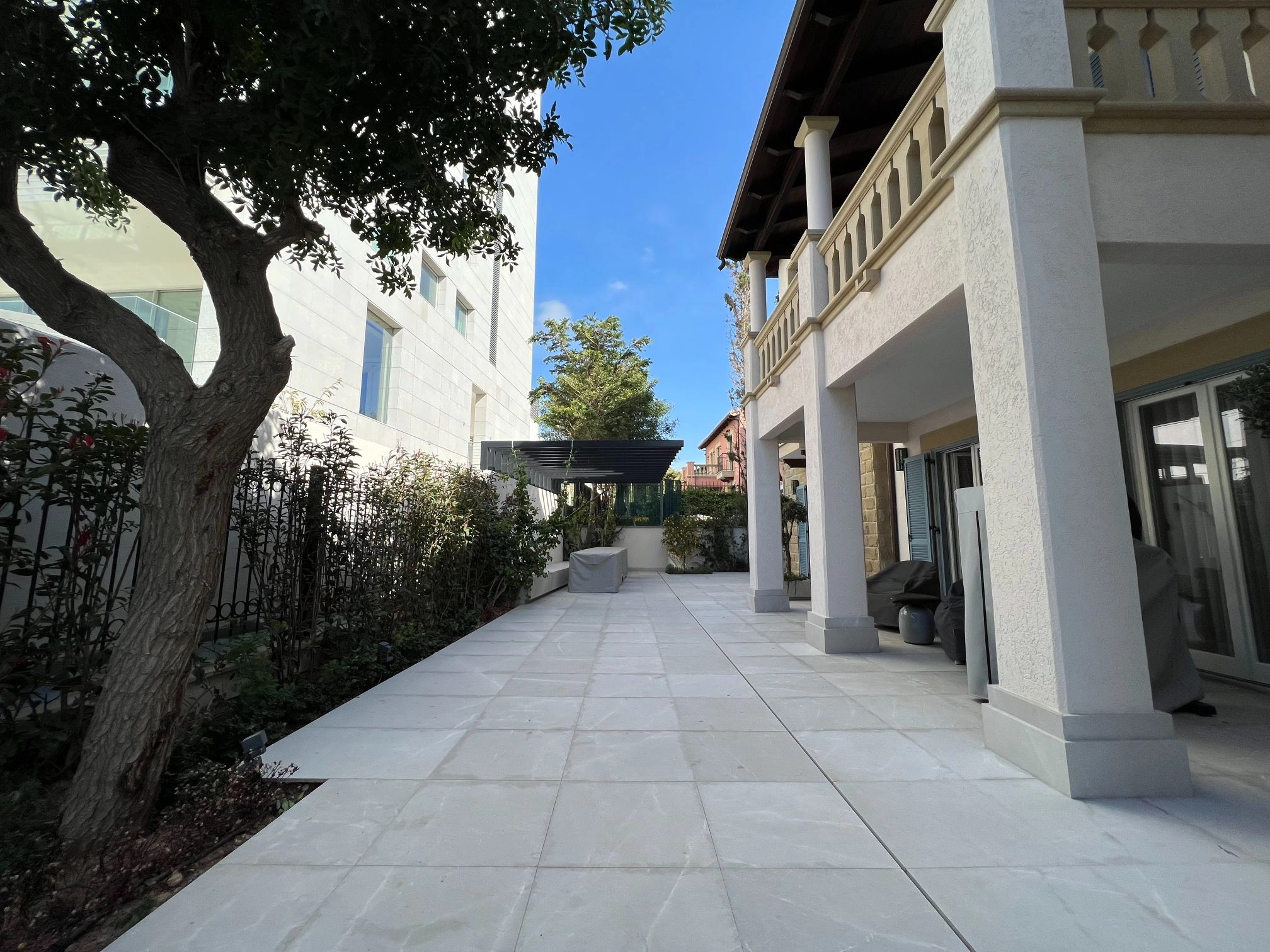 The first line, fully renovated to the highest standard 2-bedroom ground floor apartment, is located in the most impressive gated complex near the beach- The Residence complex is now available for rent. The complex has security 24/7, a large swimming pool, a gym area, private access to the beach, and beautiful, well-maintained mature gardens. The apartment is located 100 meters from the Mediterranean Sea. The covered area is 102sq.m, covered veranda is 16sq.m and plot 185sq.m. The property is fully furnished and equipped with electrical appliances. It has 2 bathrooms (showers), 2 spacious bedrooms with built-in wardrobes, a living room and dining areas, a laundry room, an open-plan kitchen, and windows (manual) shutters. Water pressure system, photovoltaic, underfloor heating(water), and VRV air-conditioning system (hot/cold).