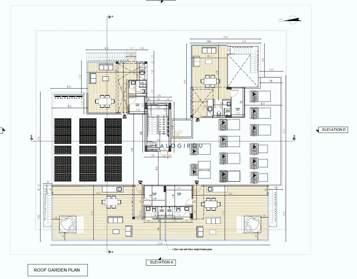 Top Floor Apartment for sale in Larnaca, Aradippou area. The apartment consists of an open plan kitchen, dining area, living room, a main bathroom with walk in shower, 2 bedrooms, one en-suite shower in the master bedroom, a covered veranda and a lovely roof garden. The roof garden consists of a siting area, a bathroom and a storage room. The residents have access to a covered parking and storage room on the ground floor.