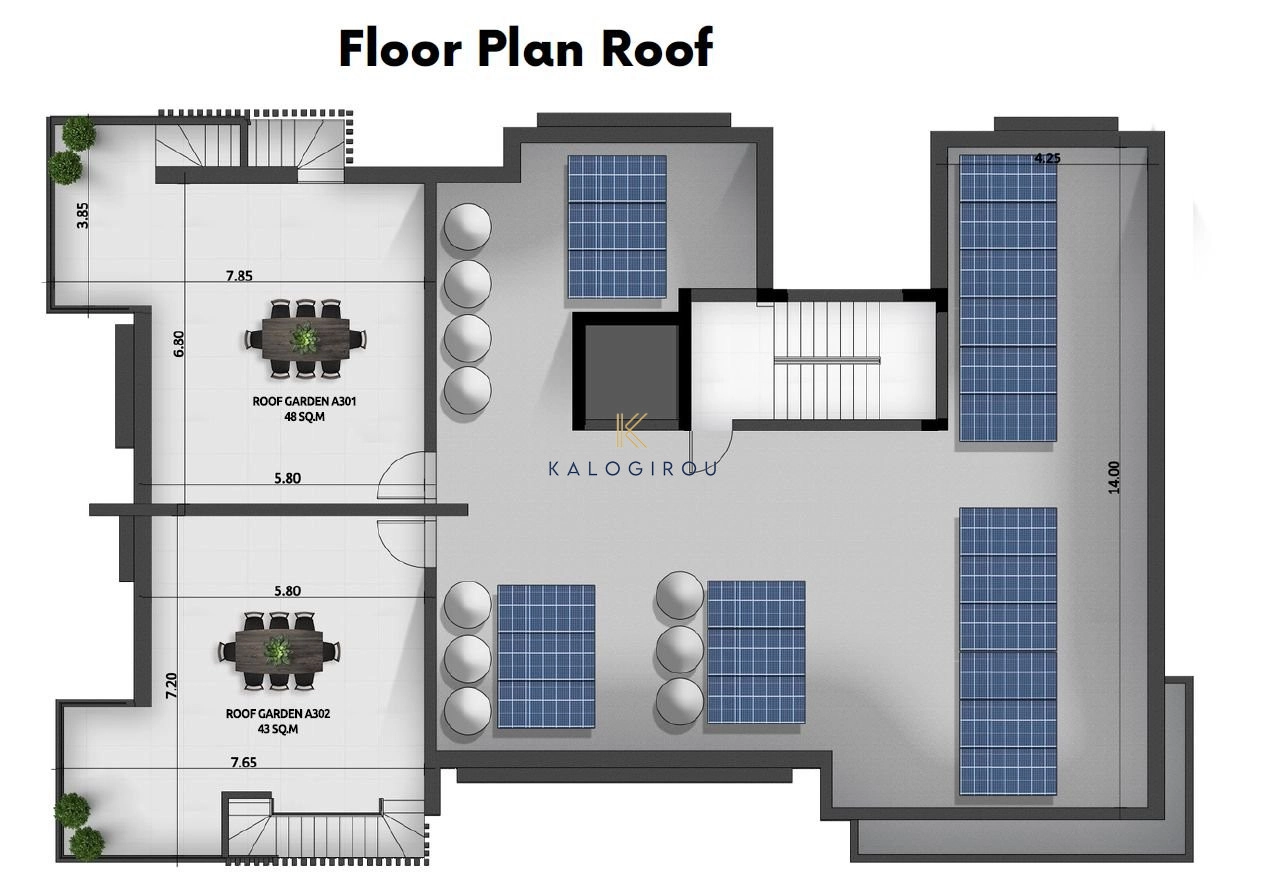 Top floor Apartment for sale in New Mall area, Larnaca Town. The property is situated on the third floor, with spacious internal covered area of 86 sqm. It consists of an open plan kitchen with dining area, living room, a main bathroom, 2 bedrooms, master bedroom is en suite shower and wc, covered veranda of 12 sqm and an amazing roof garden, accessible via external staircase. The roof garden is 48 sqm and consists of a siting area. Moreover, the residents have exclusive right of use to a private covered parking space on the ground floor.