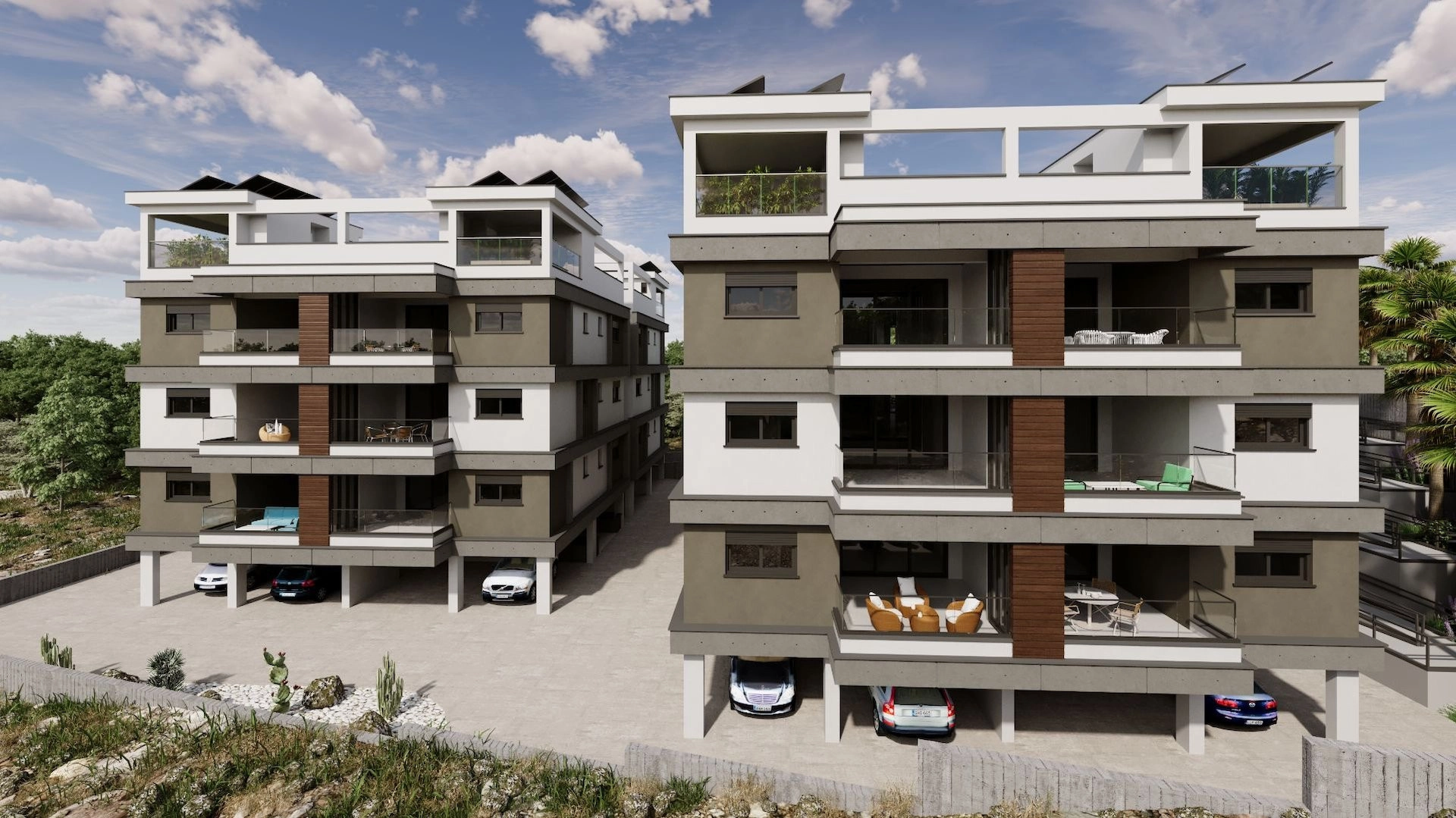 Additional features include a designated covered parking space, a private storage room, and bedroom shutters for added convenience. Each unit in the complex is equipped with provisions for air conditioning and electric heating, as well as a photovoltaic system to support energy efficiency.