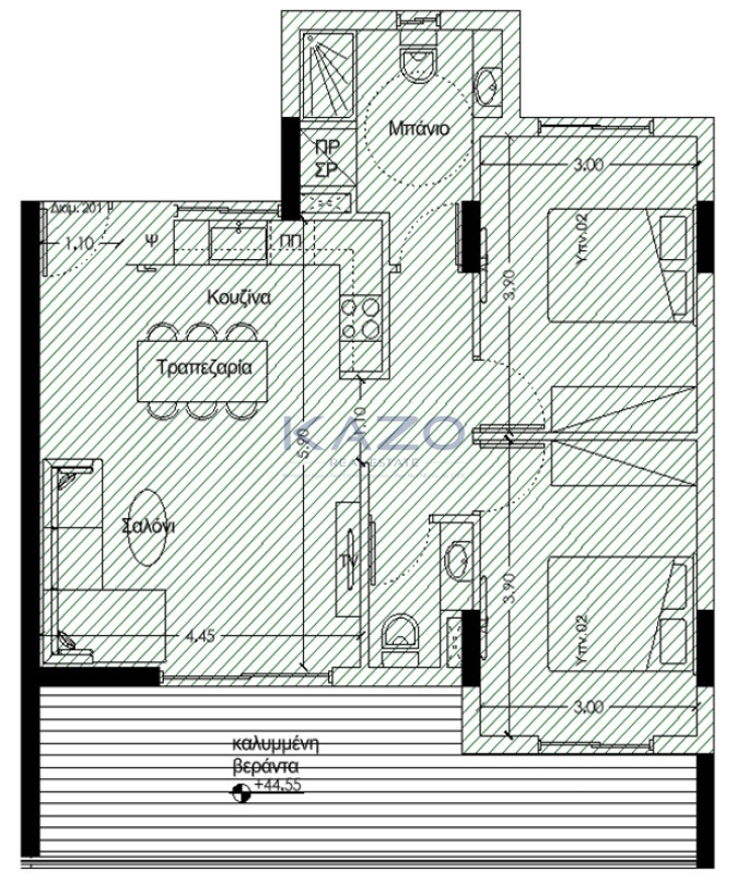 Introducing a series of beautiful two bedroom flats for sale in Agios Sylas area. The flat covers 81 sqm internal area with 26 sqm veranda and consists of a large living room, an open plan kitchen, two spacious bedrooms with an en-suite bathroom and the main bathroom. The flat is situated on the first floor of a three story building and comes with one covered parking space and a storage unit.