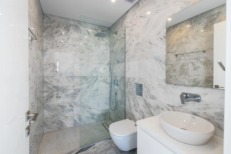 The floor beneath you, crafted from exquisite marble- style ceramic, offers a sense of timeless elegance, while rich wooden accents add a touch of warmth and refinement.