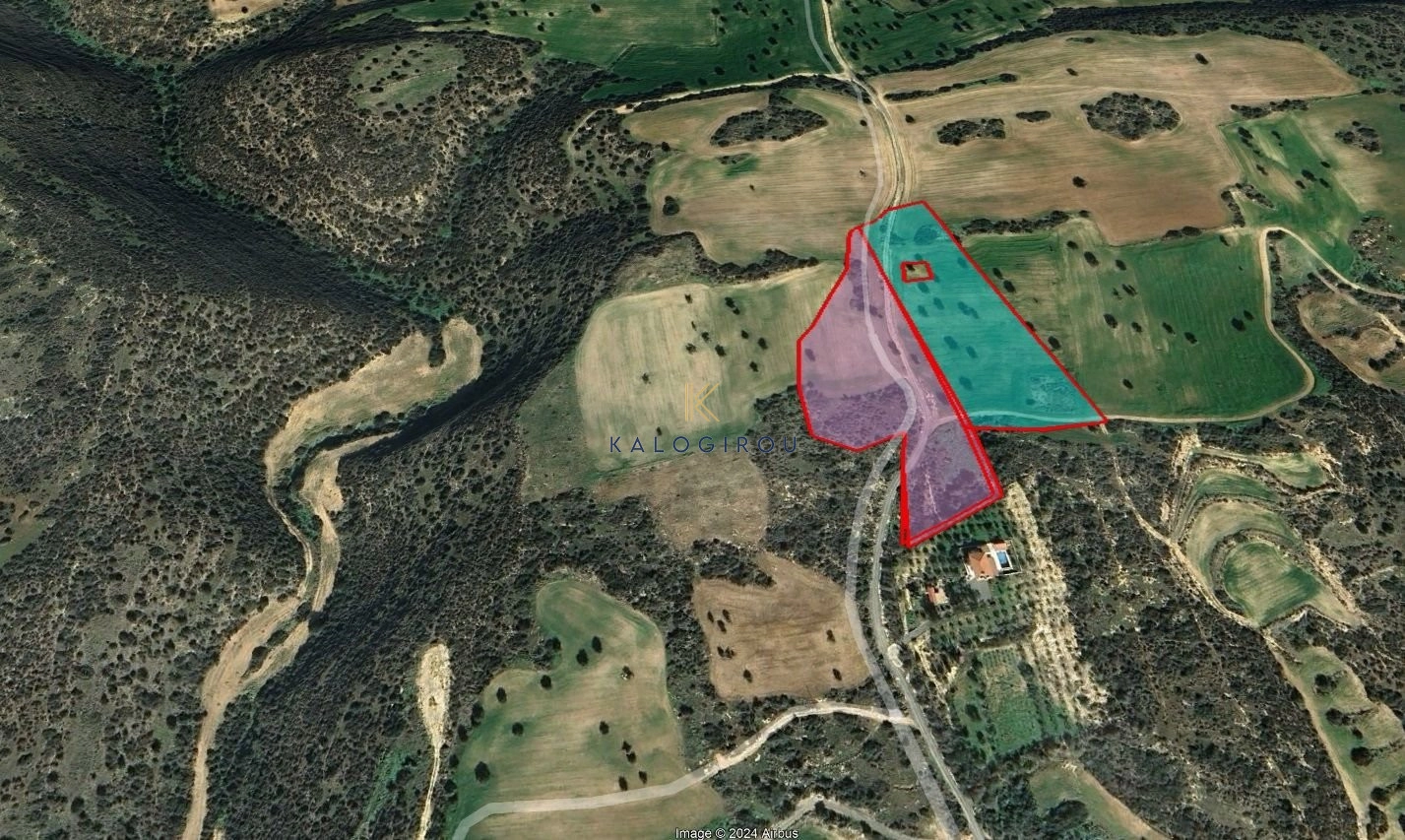 Two adjoining fields for sale in Larnaca, Agios Theodoros area. Τhe total land area of the fields is 26.800sqm. Each field has an area of 13.400 sq.m, and falls within planning Γ3 zone, with 10% density and 10% coverage, with the ability to build up 2 floors (8.3m of maximum height). The field on the left has a combination of flat even and uneven surface characteristics and an irregular shape while the field on the right has a slightly sloping surface and a rather rectangular shape.