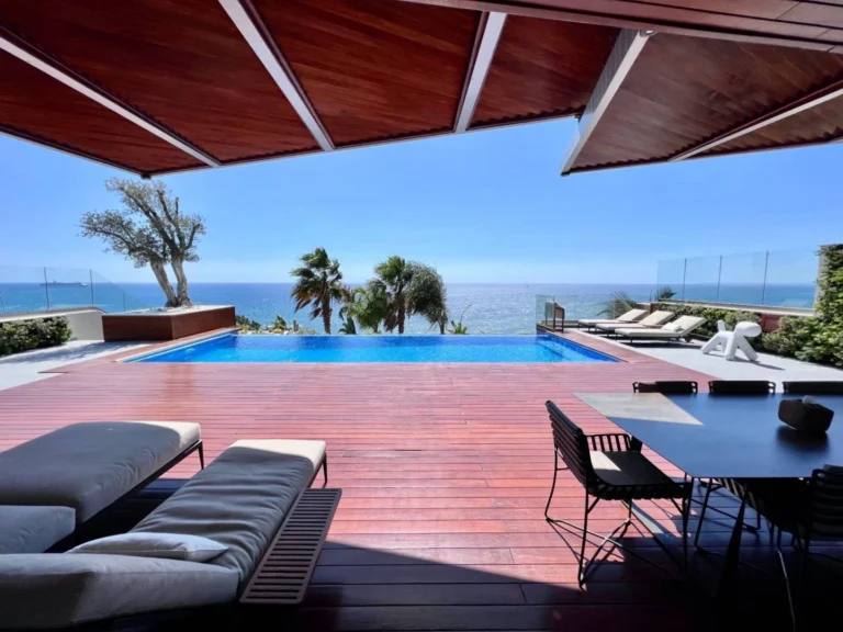 For sale 6 bedroom ultra-luxury villa with panoramic sea views is a unique and individual architectural expression combining a modern approach with refined classical elegance, located opposite the beach in the most popular residential area of Limassol, Agios Tychonas. This villa has exceeded expectations, designed by a team of international architects to be both practical and elegant with the highest technical specifications, using only the best materials, finishes and details of this one-of-a-kind villa are incomparable. Surrounded by its own luxurious landscaped garden with spacious terraces, a pond with carp fish and an overflow overflow pool that smoothly merges with the Mediterranean Sea. Forming an oasis of luxury, the villa is the epitome of spaciousness and comfort, offering a breathtaking 180-degree view of the Mediterranean Sea, located on top of the Amatunta hills at an altitude of 11 meters. On the ground floor there is an open living-dining room surrounded by floor-to-ceiling sliding windows that allow light to fill the space endlessly, and tastefully built-in wine refrigerators, plant walls and a fireplace enliven the space. A separate kitchen leads to the back of the house, where there is a staff bedroom with a bathroom, an additional kitchen pantry, a dressing room, a laundry room and a children’s playroom. On the ground floor there is access to a terrace, an infinity pool with resistance swimming equipment and a hidden automated pool covering. One of the many distinctive features are the fiber-optic lights installed throughout the exterior area within the decking of the wooden decking, tiles and pool, creating a cascade of star lights throughout the garden. The property is fully equipped with all the expected features, such as underfloor heating, full VRV air conditioning, smart home system, CCTV cameras and security equipment installed by a world-famous company with round-the-clock monitoring. Sparing no expense from design to construction, redefining the embodiment of luxury.