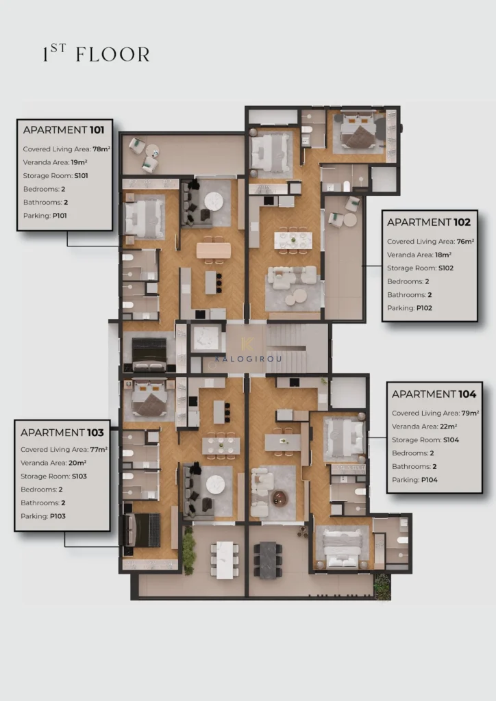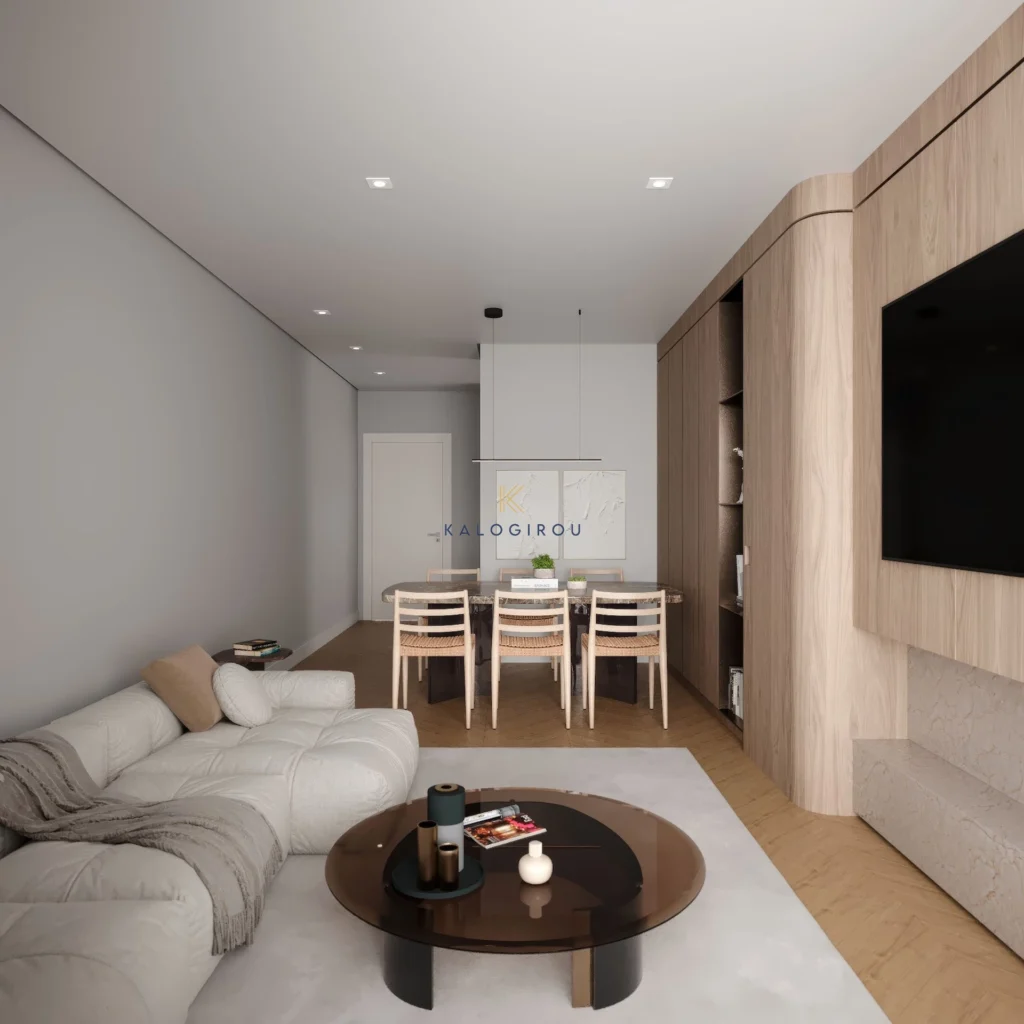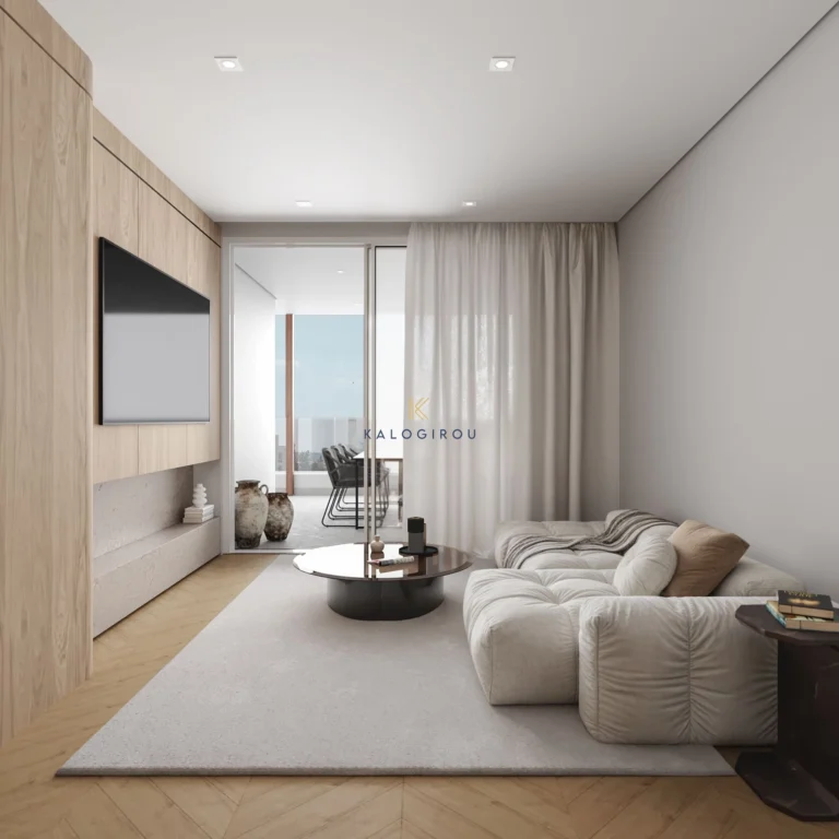 Apartment for sale in Aradippou area, Larnaca. The apartment consists of an open plan kitchen, living room, dining area, a main bathroom, two bedrooms, one of them is en suite with shower & wc, and a covered veranda. Moreover, the residents have exclusive right of use to a covered parking and storage room on the ground floor.