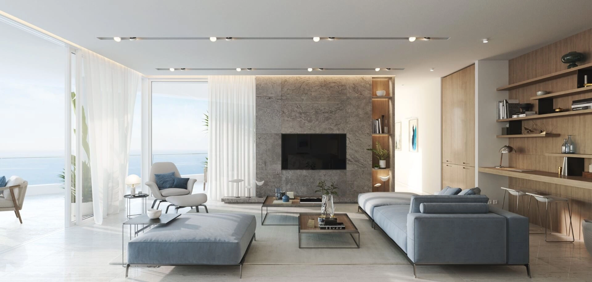 The master bedroom is designed as a private retreat with an en-suite bathroom and built-in wardrobes. Large windows capture sea views, while elegant finishes emphasize comfort.