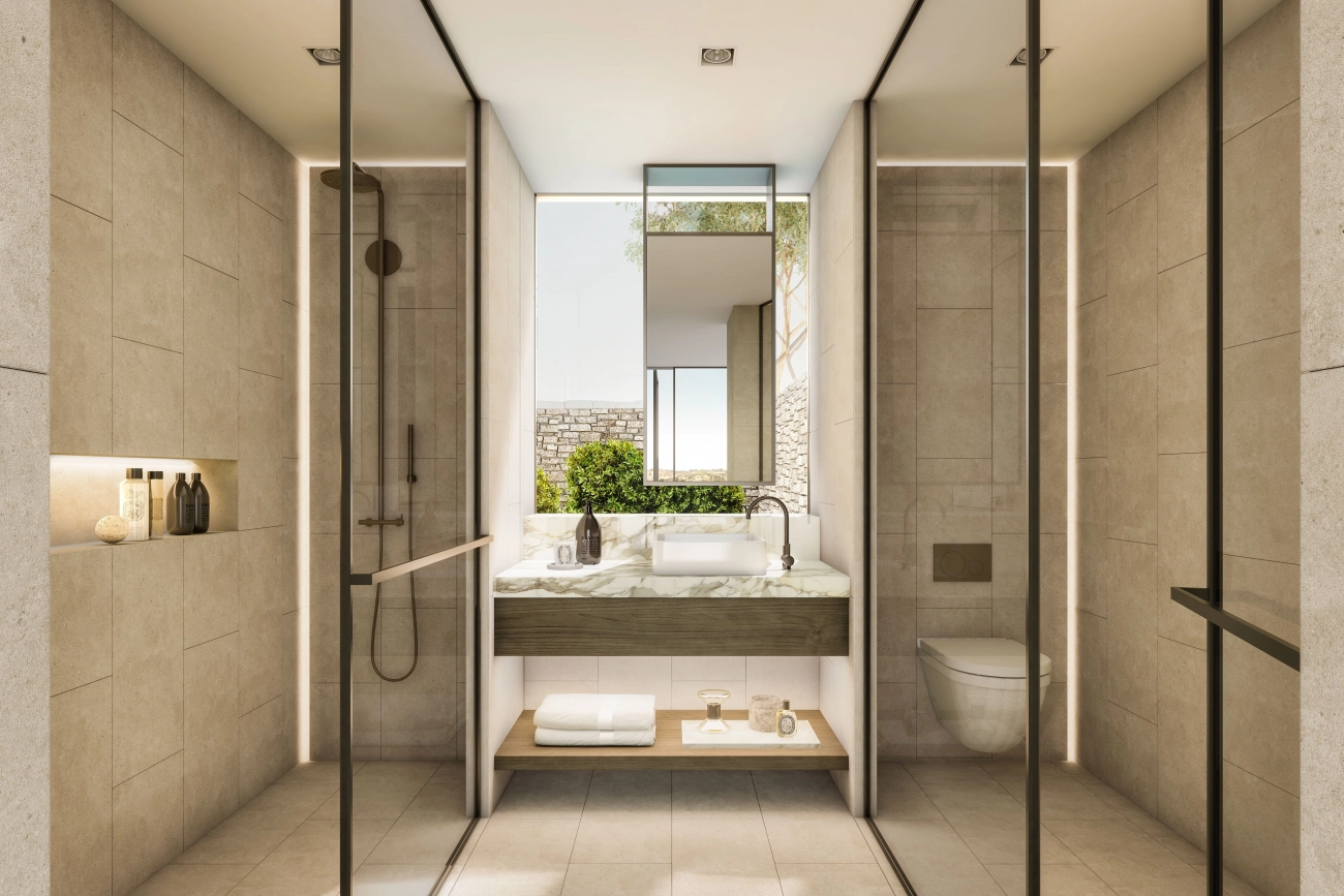 Accessed via a shaded private courtyard, its sky-high glass walls fill the open spaces with sunlight, the sunken living room’s 4.5m-high ceilings serving to enhance light and volume. The kitchen seamlessly extending on to a large deck surrounding a private plunge pool, perfect for lounging, entertaining and dining al fresco.