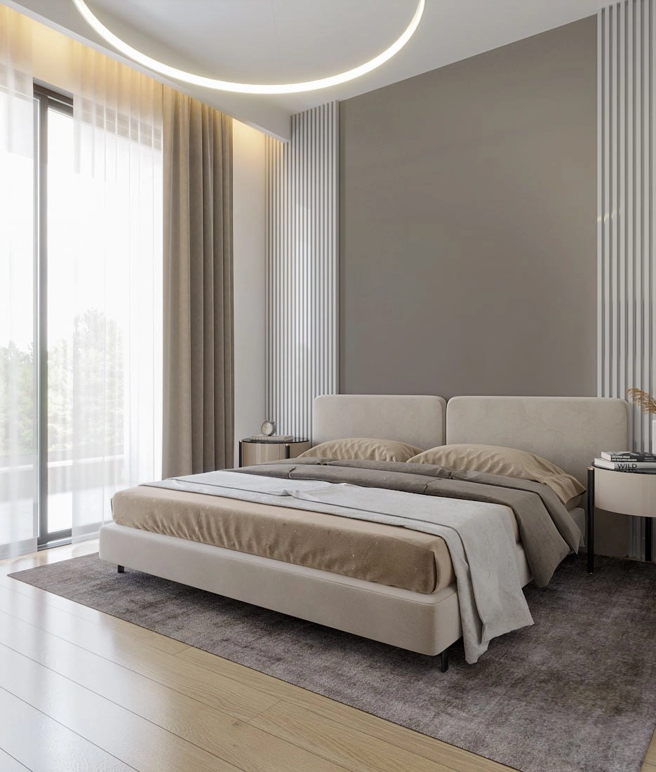 The master bedroom includes a built-in wardrobe, parquet flooring, and an en-suite bathroom finished with elegant tiling and refined fixtures.