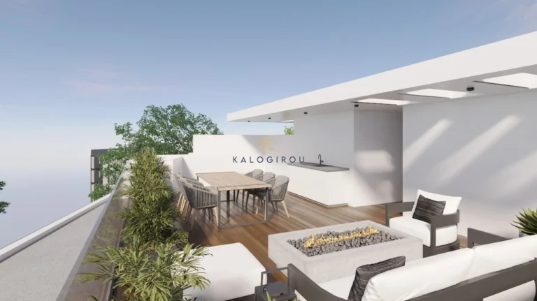 Top Floor Apartment for Sale in Port area, Larnaca. The property is on the fourth floor and consists of an open plan kitchen, living room, dining area, a main bathroom with shower, two bedrooms, one of them is en suite with shower, covered and uncovered veranda, and a large roof garden. The roof garden consists of the veranda, a storage room and a bathroom with wc. The property has also access to a covered parking and a second storage room.