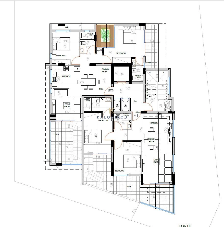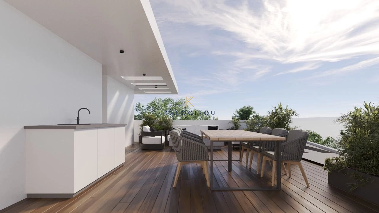 Top Floor Apartment for Sale in Port area, Larnaca. The property is on the fourth floor and consists of an open plan kitchen, living room, dining area, a main bathroom with shower, two bedrooms, one of them is en suite with shower, covered veranda, and roof garden. The roof garden consists of the veranda, a storage room and a bathroom with wc. The property has also access to a covered parking and a second storage room.