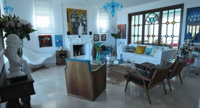 Outdoors, the property is surrounded by a landscaped Mediterranean garden featuring stone accents, mosaics, sculptures, and spacious verandas overlooking the sea, enhancing the villa’s serene coastal ambiance.
