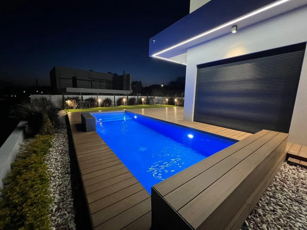 The private pool with water curtain feature is surrounded by decking and a decked veranda of approximately 40 square meters. Additionally, there is a large garden, double garage and a built barbecue area with sink and power sockets.