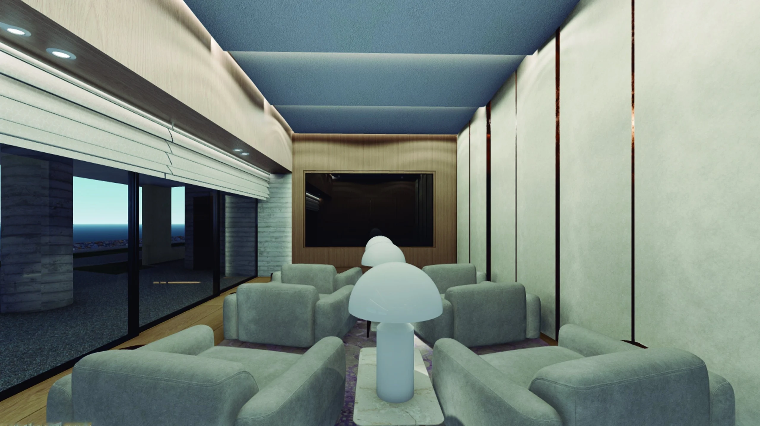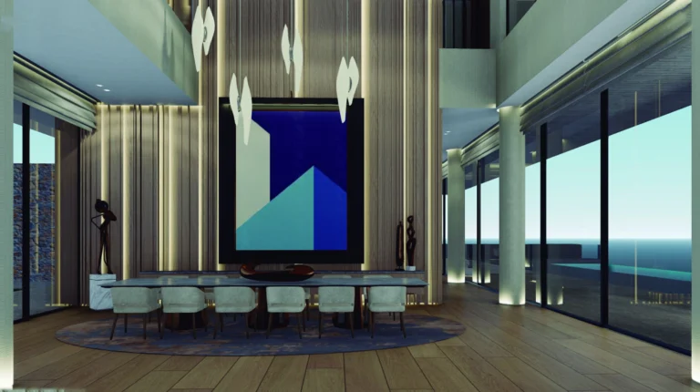 Designed across three levels, the villa embodies modern Mediterranean architecture with its clean lines, open layouts, and full-height glass balustrades that extend the horizon. The main entrance opens to a bright living area with direct access to a landscaped garden, terrace, and infinity pool. The layout is perfectly designed for entertaining, with a bar area separating the main living and dining spaces, and an additional family lounge connected to the kitchen.