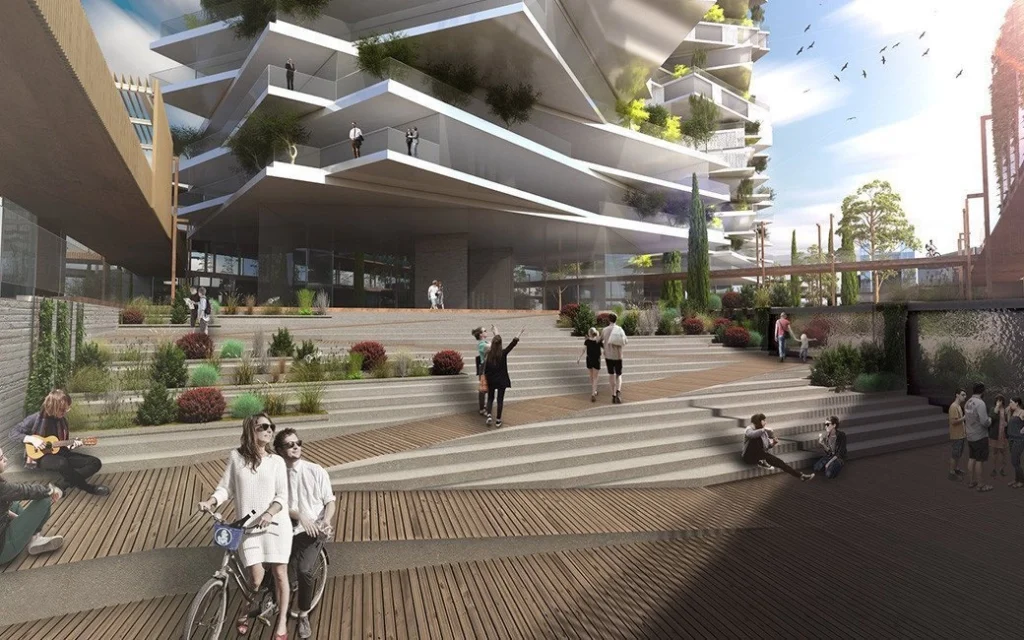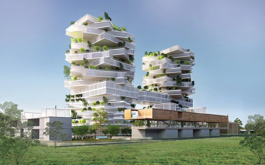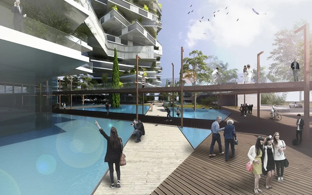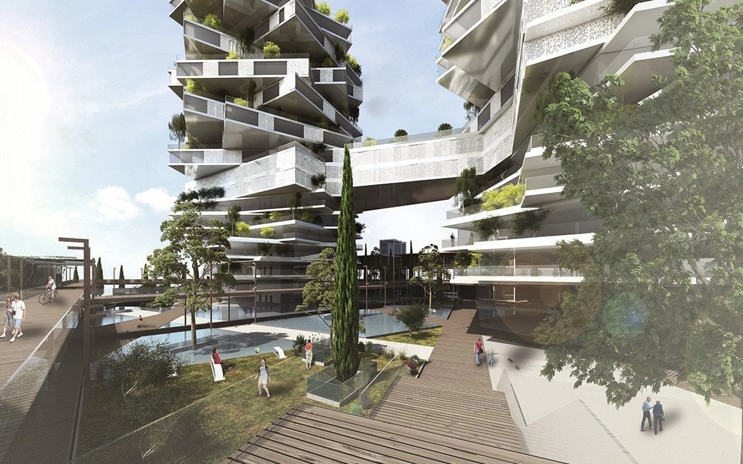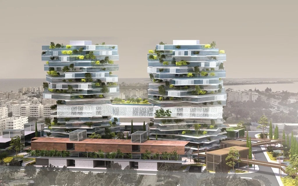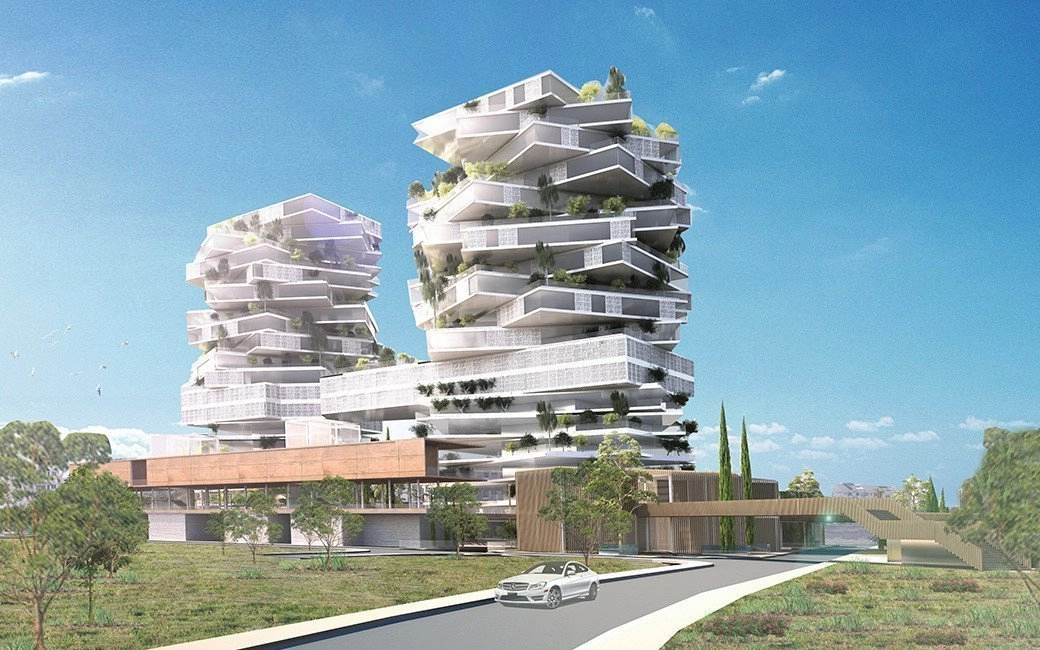 A new project is a multi-faceted development that uses the striking geometric slices which alternate horizontally by varying degrees.